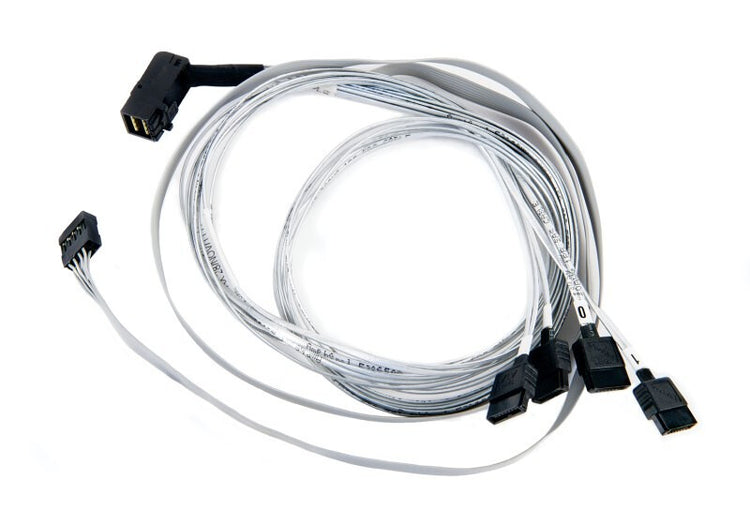 This is an internal right-angle mini-SAS HD ×4 (SFF-8643) to 4 ×1 SATA adapter-based fan-out cable with sideband signals (SFF-8448) to connect a SAS/SATA adapter to SATA disks or a SAS/SATA backplane.
