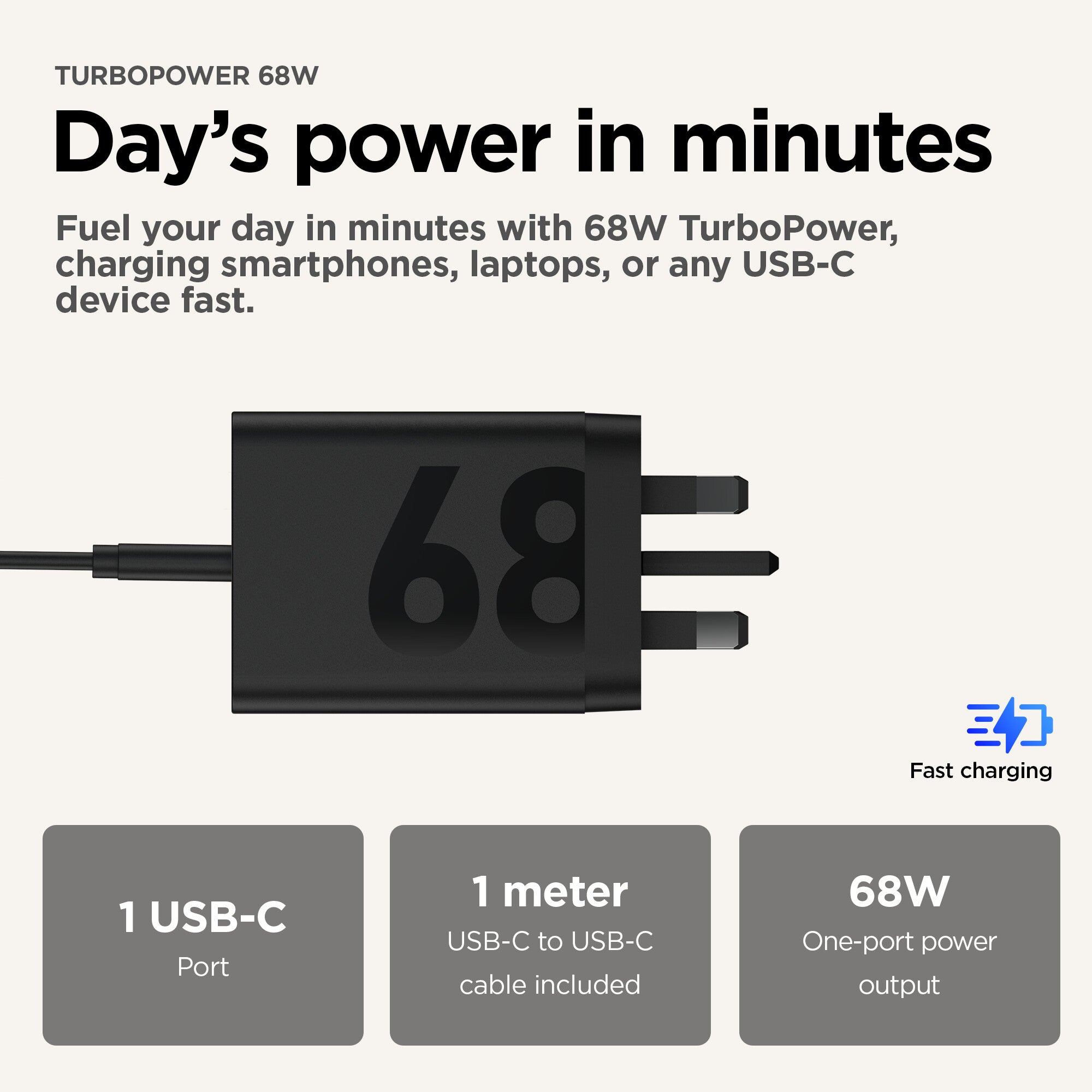 No one likes stressing about a low battery, especially before a big night out or a busy day at work. That’s why there’s the TurboPower™ family of chargers, giving you hours of power in just minutes.(7) Power up your smartphone, tablet, laptop, smartwatch, earbuds, and more in your choice of 68W(1) Universally compatible with a vast number of devices worldwide, TurboPower™ chargers are the only ones you need. Plus, they’re designed to fit easily into your pocket or bag. Featuring TurboPower™ Shield, you’ll enjoy peace of mind thanks to protection from overheating, voltage spikes, and more—even when charging at full speed.