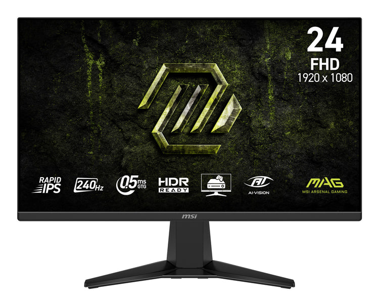 Experience immersive gaming with the MAG 245F X24 gaming monitor. It features a 1920 x 1080 (FHD) panel, a 240Hz refresh rate, and a rapid 0.5ms (GtG, Min.) response time. The monitor is HDR Ready, enhancing eye-catching details through adjustments in contrast and shadows. Designed for competitive FPS, first-person RPG/MMORPG, and flight/racing simulator genres, the MSI MAG 245F X24 gaming monitor takes casual gaming to a new level, challenging players to see beyond the game.