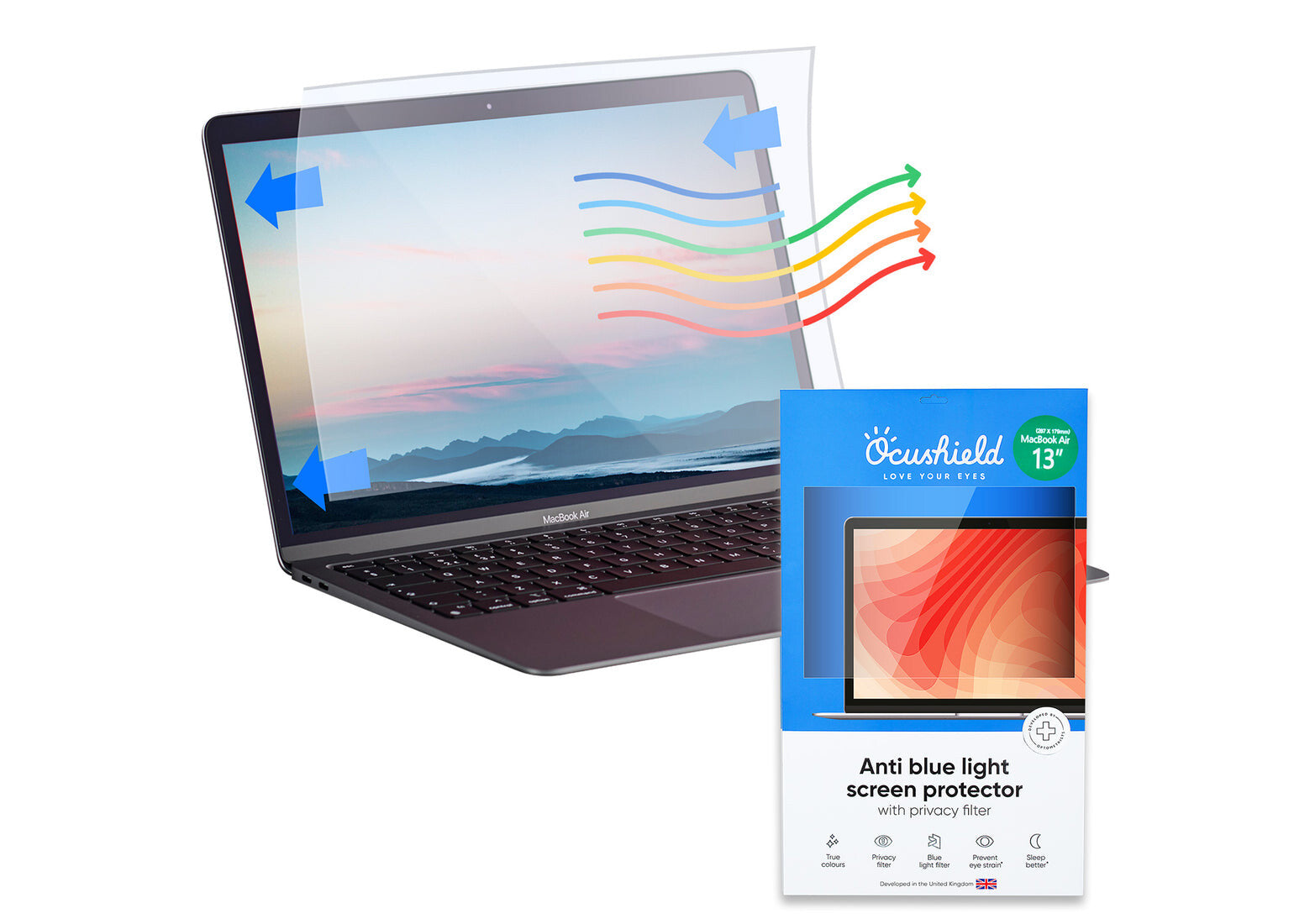 Fortunately though, Ocushield’s blue light filters for MacBook Air and Pro block blue light before it gets to your eyes. This helps to keep them in tip-top condition, reducing dryness and facilitating focus.
