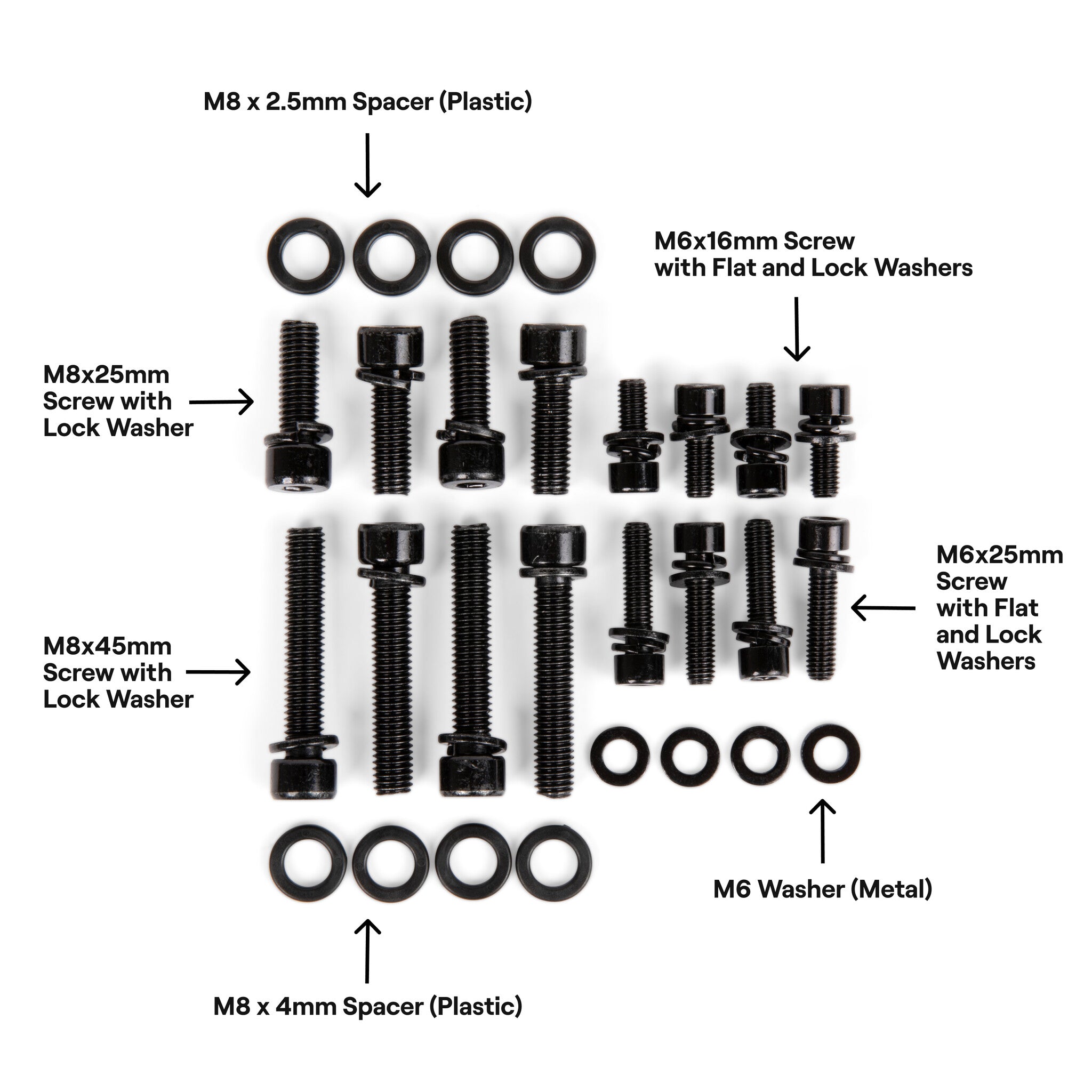 | Packaging content | Owl Bar TV Mount(QTY 4) M8x45mm Screw w/ Lockwasher(QTY 4) M8x25mm Screw w/ Lockwasher(QTY 4) M6x25mm Screw w/ Flat and Lock Washers(QTY 4) M6x16mm Screw w/ Flat and Lock Washers(QTY 2) M8 x 10.5mm Spacer (Plastic)(QTY 4) M6 Washer (Metal)(QTY 4) M8 x 4mm Spacer (Plastic)(QTY 4) M8 x 2.5mm Spacer (Plastic)(QTY 1) 5mm Hex Wrench(QTY 2) M4x5mm Screw |