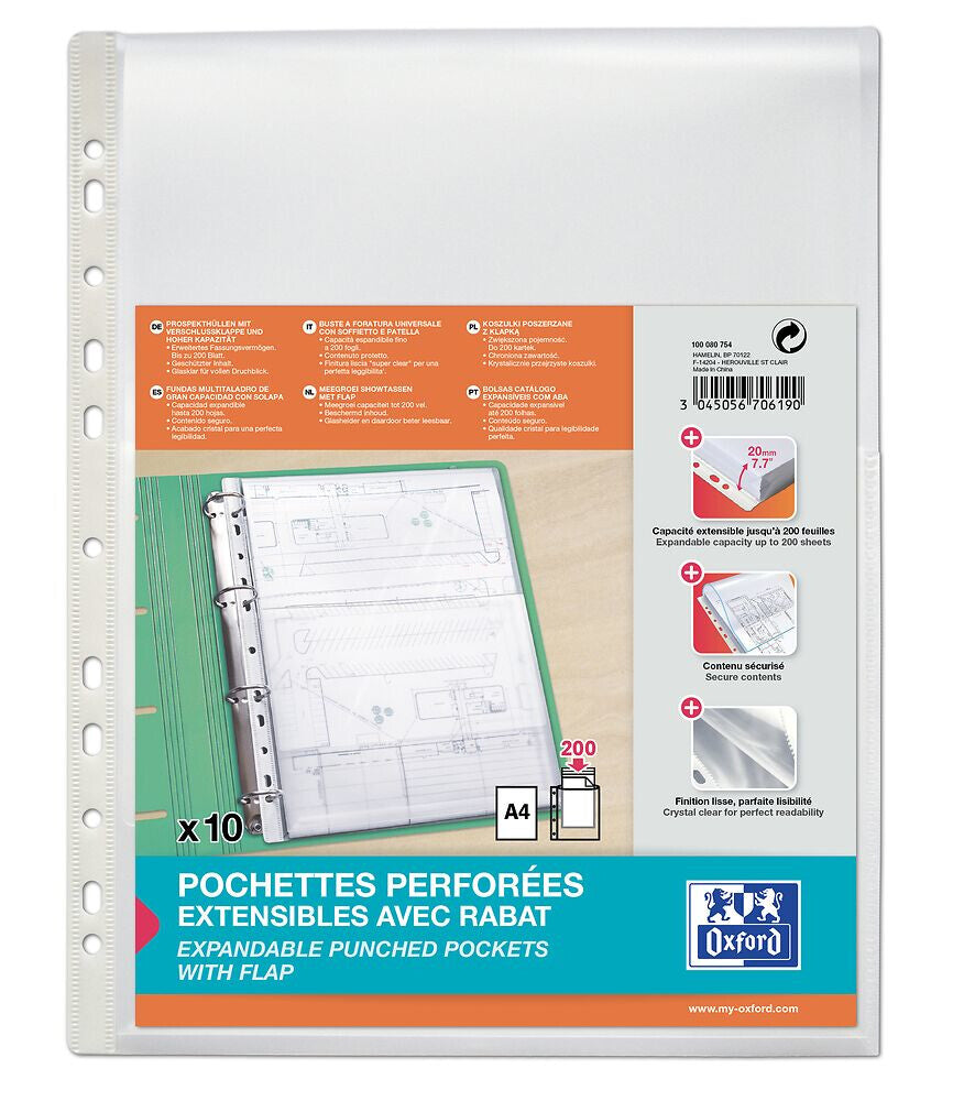 Of high quality, this punched pocket offers an expandable gusset with a 2cm thickness that allows to contain up to 200 A4 sheets. Its embossed material is stain free and anti-reflective for a durability over time. It offers a flap that secures the content. It is available in Clear.