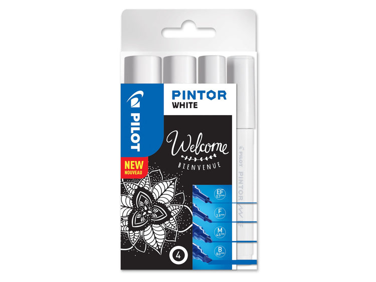 Express your individuality and creativity with a vibrant range of colours with PILOT PINTOR - a water-based paint marker, which is suitable for use on all surfaces. With Pintor markers, you can customise craft, doodle, colour and decorate anything that you can think of – the limit is your imagination! This wallet of 4 mono-chrome markers in different tips (Extra fine, fine, medium and broad) will get you started with any art & craft project.