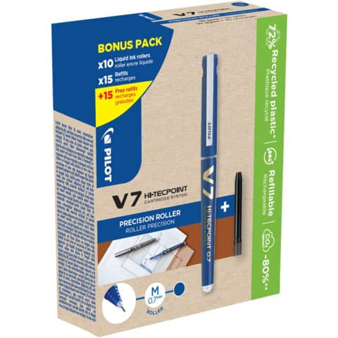V7 Cartridge System – Refillable liquid ink rollerball pen, made from 71%* recycled plastic (10 pens + 10 sets of 3 refills)