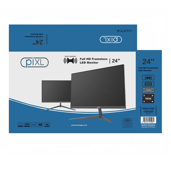 piXL PXD24VH 24 Inch 24 Inch Frameless Monitor, Widescreen, 6.5ms Response Time, 60Hz Refresh Rate, Full HD 1920 x 1200, 16:10 Aspect Ratio, VGA, HDMI, Internal PSU, Speakers, 16.7 Million Colour Support, Black Finish
