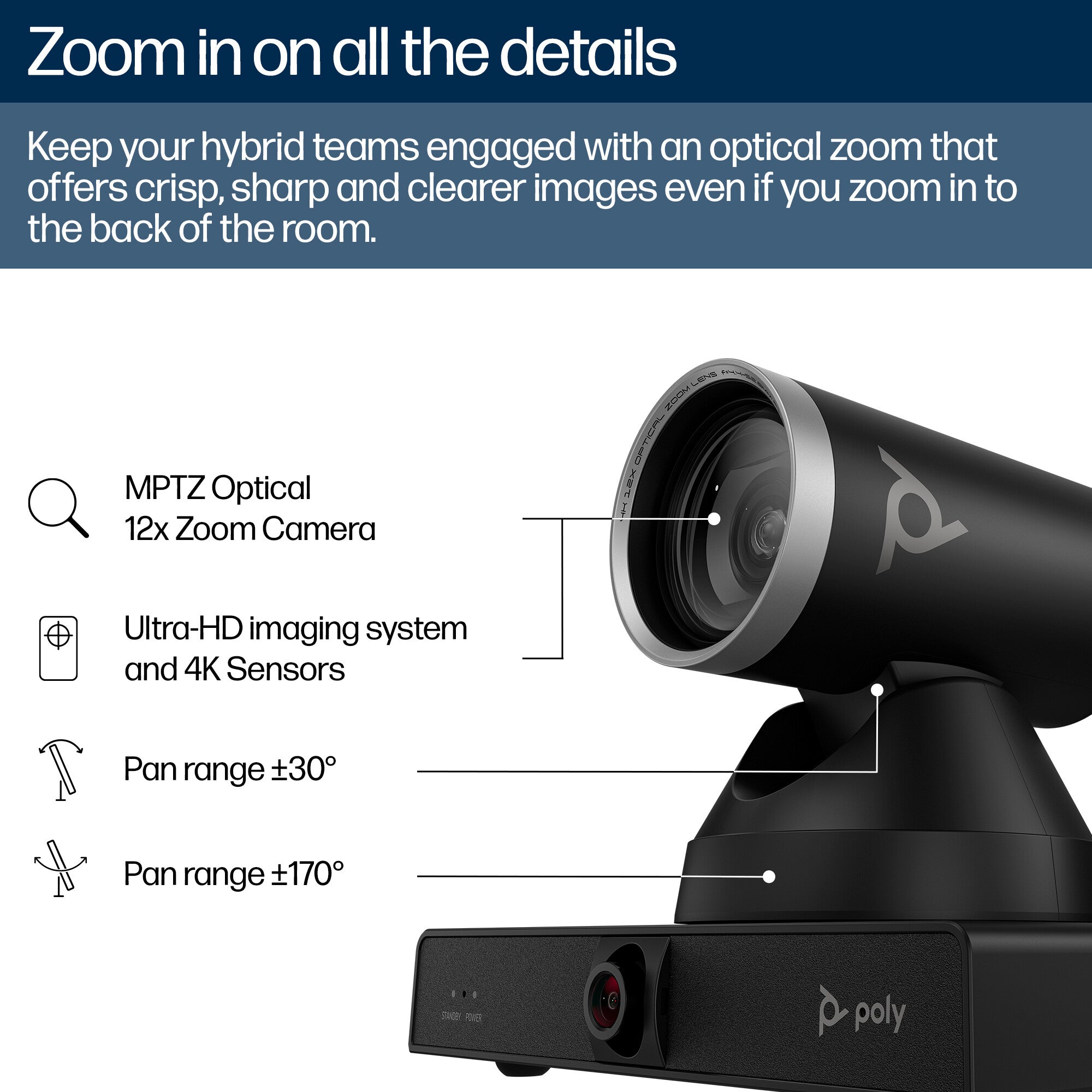 - Whether in person or remote, keep your teams engaged no matter where they’re seated. Make sure they pick up on every detail with true-life definition including small gestures and expressions even in large rooms with a 12x optical zoom.