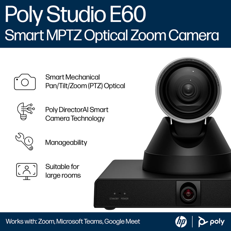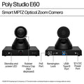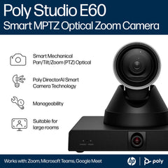 - Kickstart meetings without delays and make every minute count with the Poly Studio E60 smart optical zoom camera. Its flexible connectivity and compatibility with top conferencing platforms simplifies things so you can solely focus on your presentation.