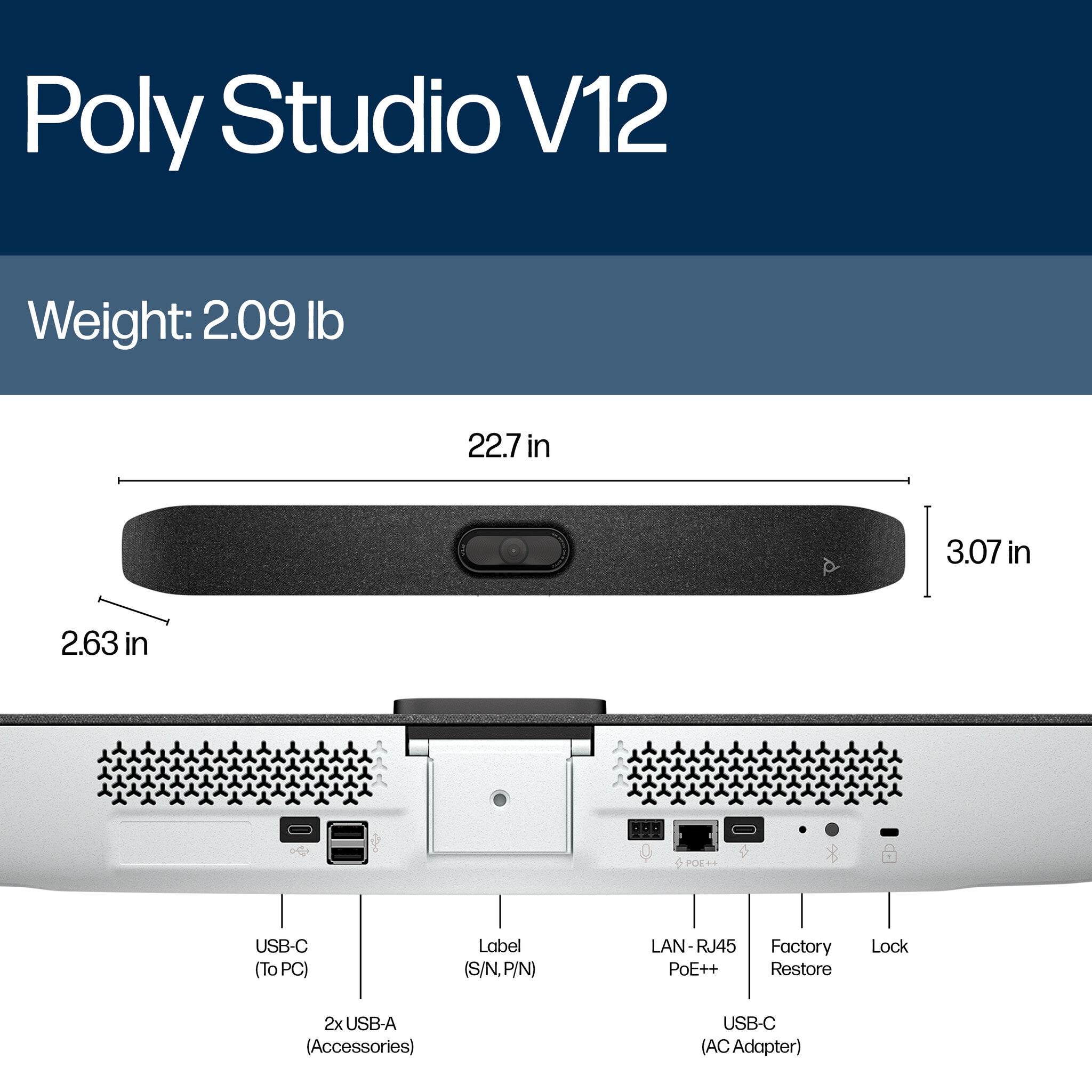 The Poly Studio V12 USB video bar has you covered for successful conferencing in any small room. Users will feel empowered when walking into BYOD rooms with superior AI-driven AV capabilities, simple deployment and centralized management.