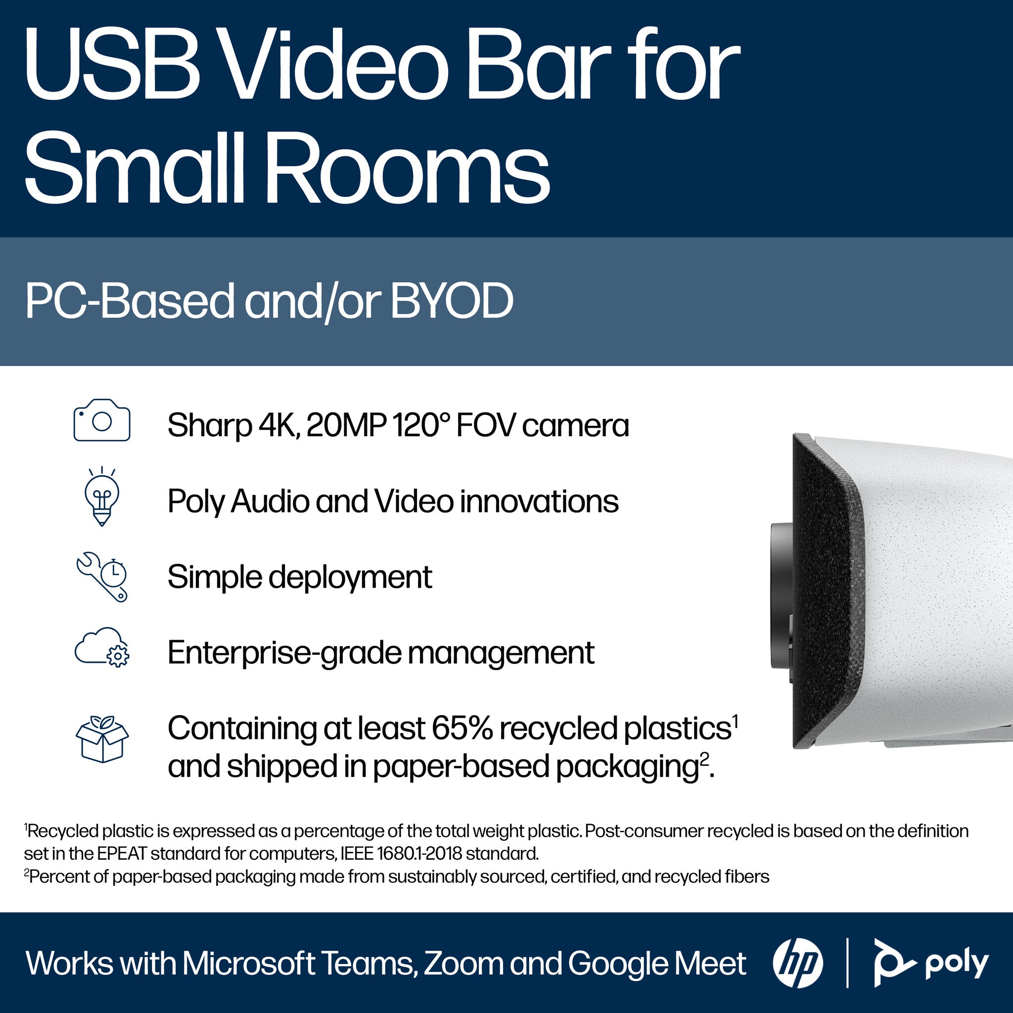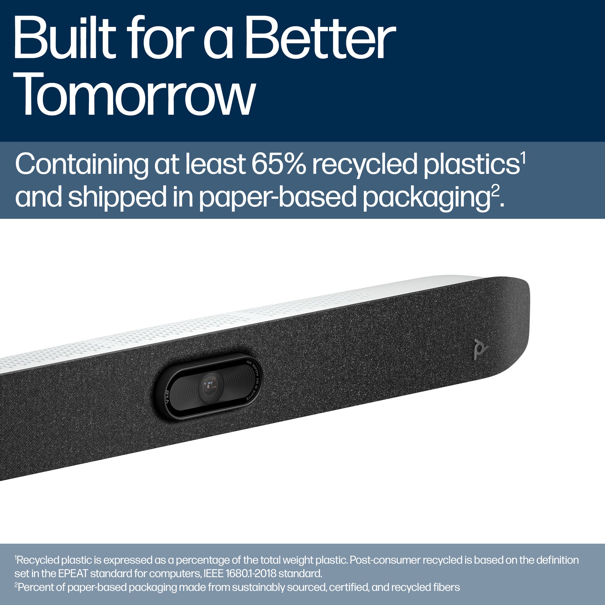 - Containing at least 65% recycled plastics[1] and shipped in paper-based packaging[2], this USB video bar enables more impactful meetings in small rooms with less impact on the environment.