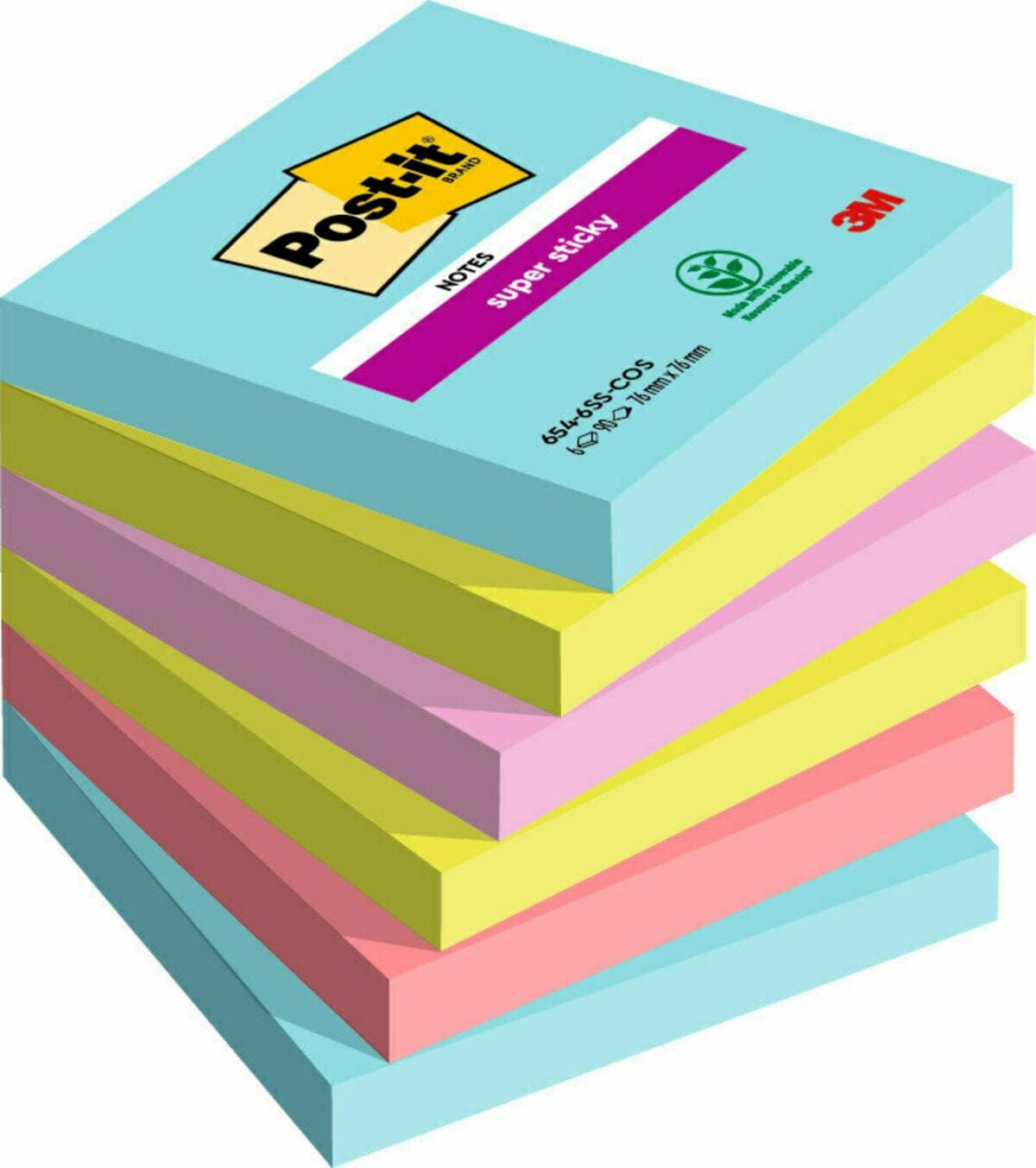 Post-it® Super Sticky Notes hold stronger and last longer. They have 2x the sticking power of Post-it® Original Notes so you can be sure that your message gets through. Perfect for vertical and hard to stick to surfaces, these self stick notes are ideal for making notes or leaving messages and reminders. Coming in bright and intense colours, they’re super strong, super versatile and designed to make your messages stand out. Made from PEFC certified paper, sourced from certified, renewable and responsibly managed forests, with a 60 % renewable resource adhesive from a plant that regrows annually.