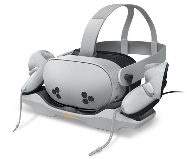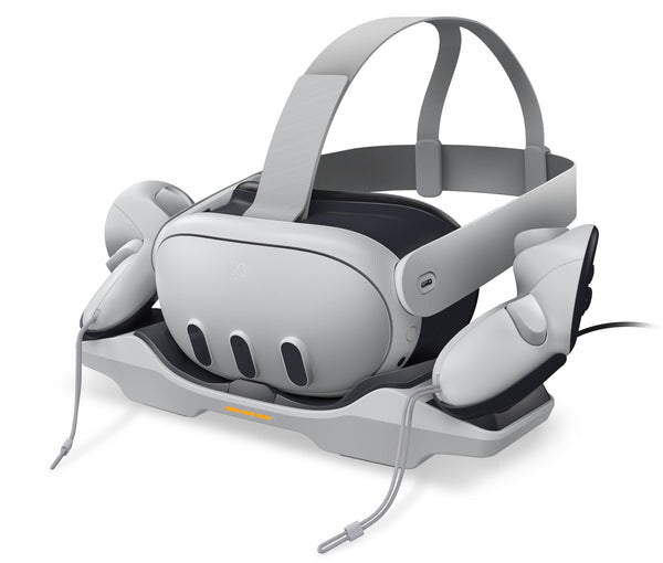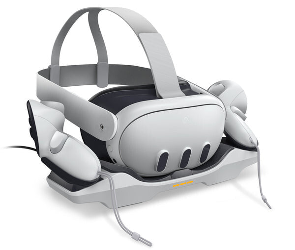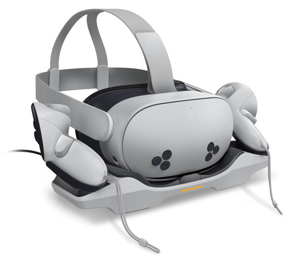 Simultaneously charge and display a Meta Quest 3 / 3S VR headset and two controllers. No cables required to plug into the VR headset and controllers.