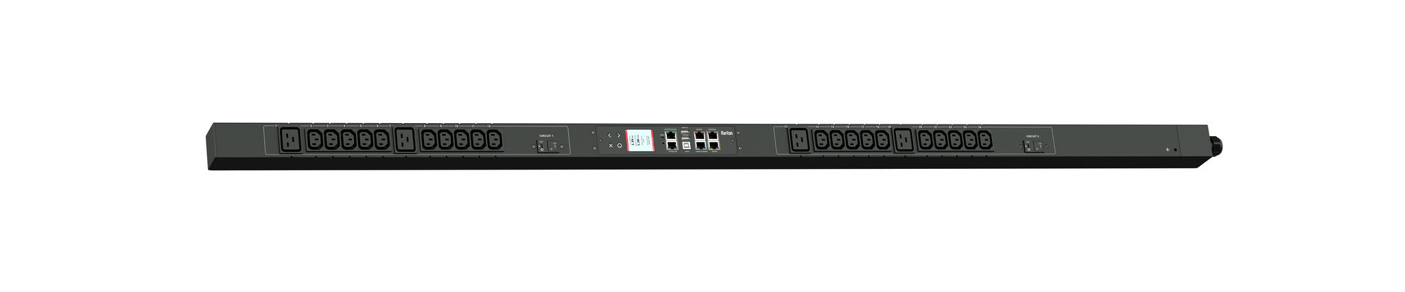 Monitored rack power distribution unit (0U [vertical], 7.4kVA, 24 outlets). INPUT: 230v, 32a - IEC 60309 2P+E 6h 32A plug (2P3W); OUTPUT: 20@ C13, 4@ C19 outlets; on 2@ 1-pole, 16a Overcurrent Protectors; FEATURES: Billing-Grade (+/- 1%) Energy Metering [kW, kVA, V, A, Power Factor] - per inlet, per breaker/fuse; Color, matrix LCD display : Voltage, current, or active power (per line or per breaker); Alarms; Configuration information (name, ratings, IP / Networking).; Field-Replaceable, hot-swappable network module with 536MHz processor, 16MB SPI Flash, and 64MB DDR2 RAM; Gigabit(10/100/1000) Ethernet port. Secondary, redundant Ethernet port. Redundant power sharing between network modules.Remote network monitoring via HTML, JSON-RPC, SSH, Telnet, MODBUS/TCP, and SNMPv3. Environmental monitoring [temp/humidity] capable of up to 32 sensors. Individual outlet numbers labeled on chassis. Automated deployment via TFTP, DHCP/PXE, SSH(CLI), or USB Flash Drives. WiFi Capable. USB Webcam Capable. iPad/iPhone/Android App. Breaker metering and alarming (0V detection). Max Dimensions 52mm x 55mm x 1539mm (2.1in x 2.2in x 60.6in). Max Weight 5.5 kg. Maximum ambient temperature 60C at full load.