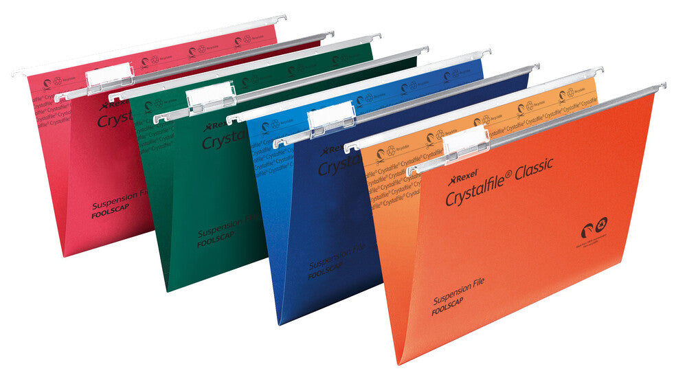 Box of 50 Foolscap Green files (387 x 240mm). Suspension files can be used for filing cabinets, desk drawer chassis and desk top organisers. Supplied complete with tabs and printable inserts. Free additional set of A-Z inserts included. Also available in red, blue and orange.