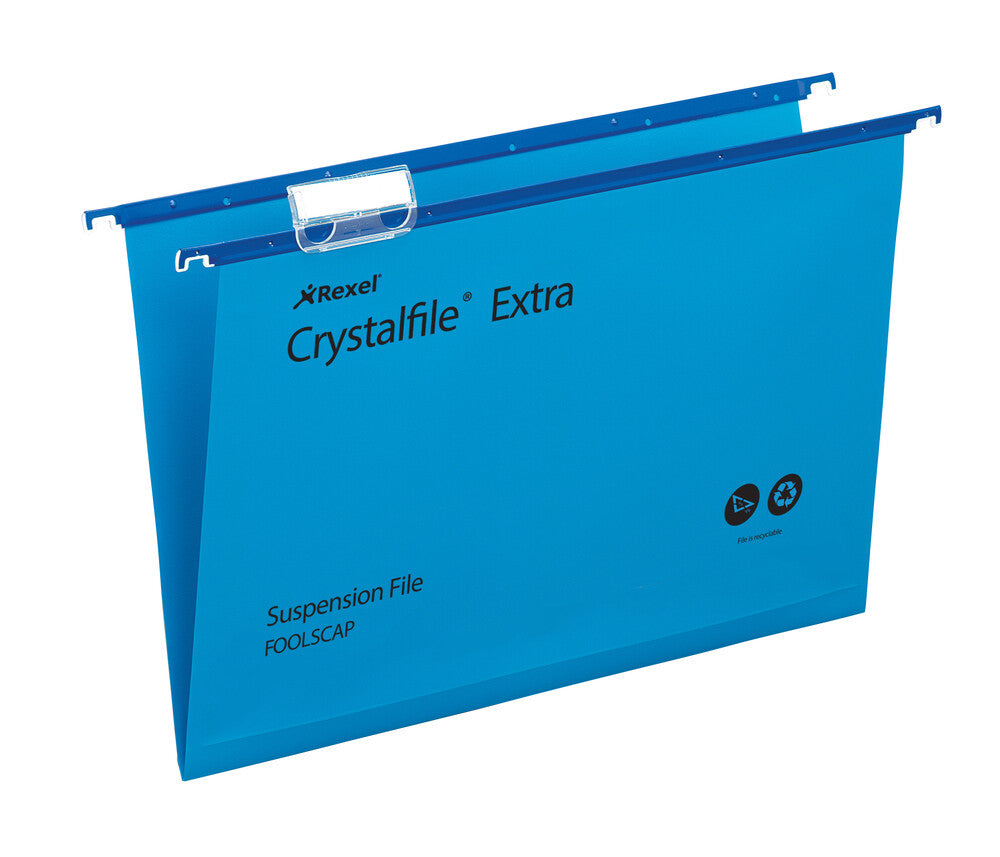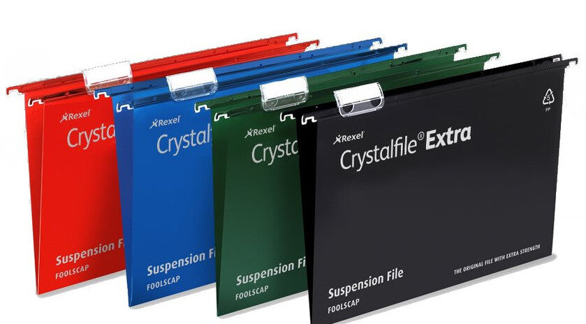 Rexel Crystalfile™ Extra Suspension Files are made from tough polypropylene which typically lasts up to 5 times longer than manilla. With a wipe clean satin finish and featuring matching coloured runners and multi-positionable tabs, they come in boxes of 25.