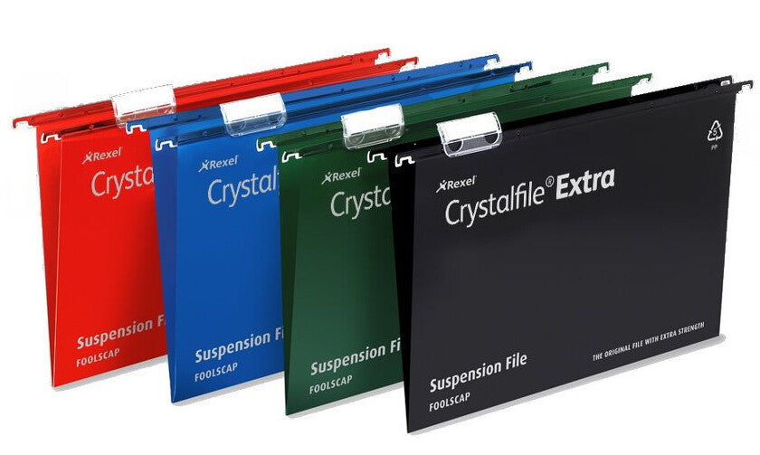 Rexel Crystalfile™ Extra Suspension Files are made from tough polypropylene which typically lasts up to 5 times longer than manilla. With a wipe clean satin finish and featuring matching coloured runners and multi-positionable tabs, they come in boxes of 25.