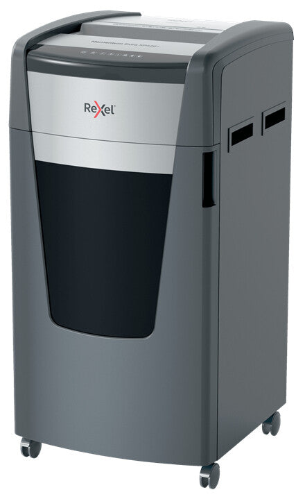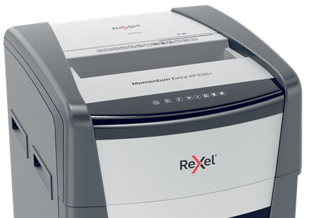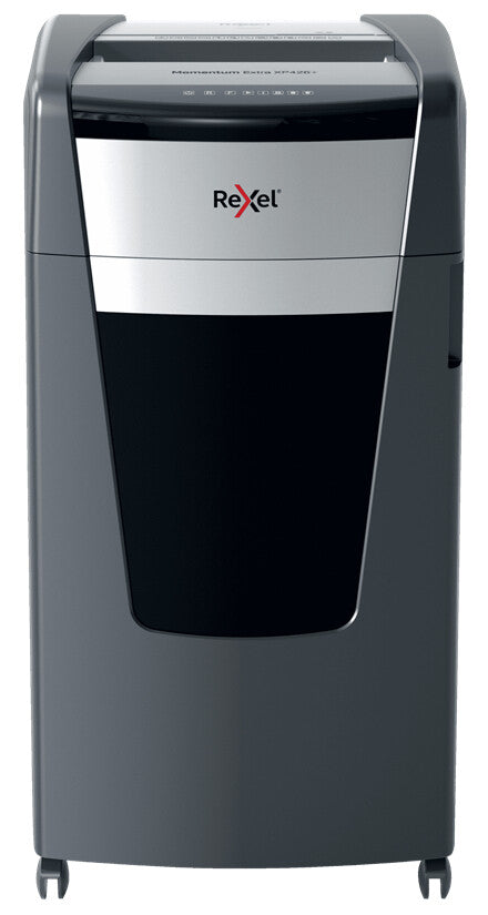 Rexel Momentum Extra jam free paper shredders are ideal for destroying confidential documents in the office. The XP422+ shredder machine shreds up to 22 sheets of A4 paper (80gsm) in one go through the manual feed slot into P-4 (4x35mm) cross cut pieces. Active sensing technology measures the number of sheets being fed in real-time to stop paper jams and misfeeds; indicated by a red LED on the control panel. This paper shredder will not operate until the number of sheets is reduced below or at the maximum sheet capacity. This cross cut shredder is designed for moderate to heavy use with its high sheet capacity, large 85L bin size and continuous run time. There's no need to remove staples and paper clips first; this Rexel shredder also safely shreds CD's, DVD's and credit cards through a separate feed slot.