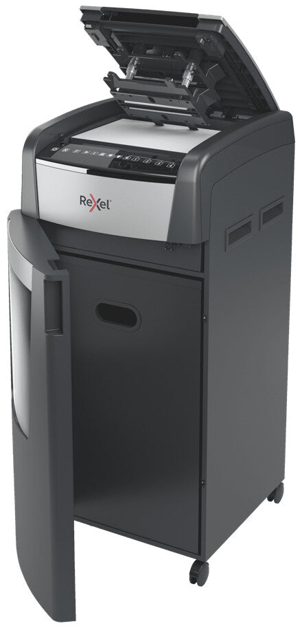 The Optimum AutoFeed+ 750X cross cut shredder automatically shreds up to 750x A4 sheets of paper (80gsm) at a time, into P-4 (4x30mm) cross cut pieces. This auto feed shredder machine is a sophisticated office shredder, featuring a 140L pull out bin. No need to manually feed paper, or remove staples and paper clips first, this automatic paper shredder will do all the work for you.
