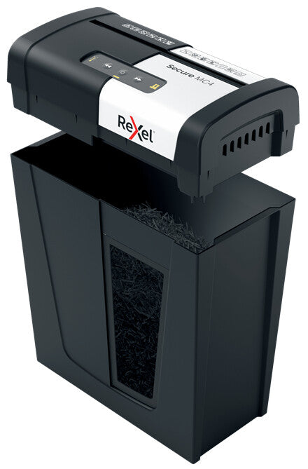 Rexel's range of Secure paper shredders are ideal for destroying your personal documents and sensitive information at home. The Secure MC4 shredder machine shreds up to 4 sheets of A4 paper (80gsm) in one go through the manual feed slot into P-5 (2x15mm) micro cut pieces. This micro cut shredder is perfect for use as a home shredder or in a home office due to its small and compact size. It is also an ideal personal office shredder that fits conveniently under a desk and operates with Whisper-Shred low noise. Designed for light to moderate use with a 14L bin capacity for less frequent emptying.