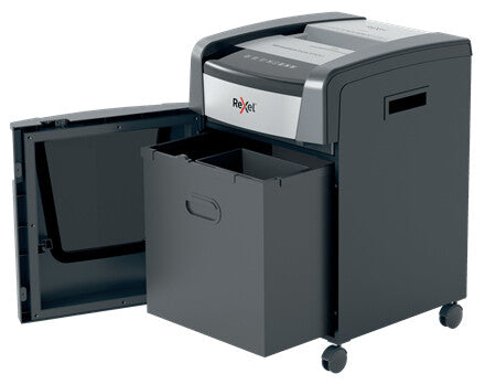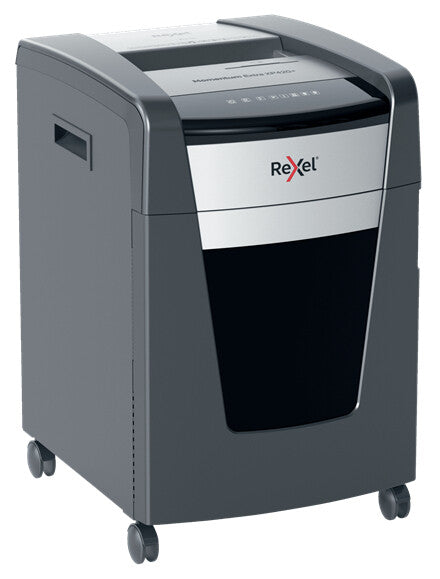 Rexel Momentum Extra jam free paper shredders are ideal for destroying confidential documents in the office. The XP420+ shredder machine shreds up to 20 sheets of A4 paper (80gsm) in one go through the manual feed slot into P-4 (4x35mm) cross cut pieces. Active sensing technology measures the number of sheets being fed in real-time to stop paper jams and misfeeds; indicated by a red LED on the control panel. This paper shredder will not operate until the number of sheets is reduced below or at the maximum sheet capacity. This cross cut shredder is designed for moderate to heavy use with its high sheet capacity, large 60L bin size and continuous run time. There's no need to remove staples and paper clips first; this Rexel shredder also safely shreds CD's, DVD's and credit cards through a separate feed slot.
