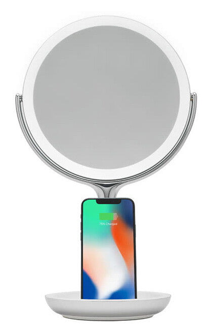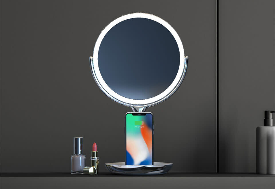 - 8” round vanity mirror with LED lights and Qi wireless charging pad