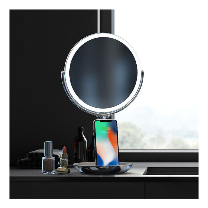 The Spa Studio LED Vanity Mirror with Wireless Charging by Sharper Image is the space-saving solution for your dresser or bathroom counter. This handy 8” round mirror features dual 1X and 5X magnification, a magnetic 10X mini mirror and dimmable LED lights. The base doubles as a wireless charging stand, so you can watch and charge your phone while you apply makeup or style your hair.