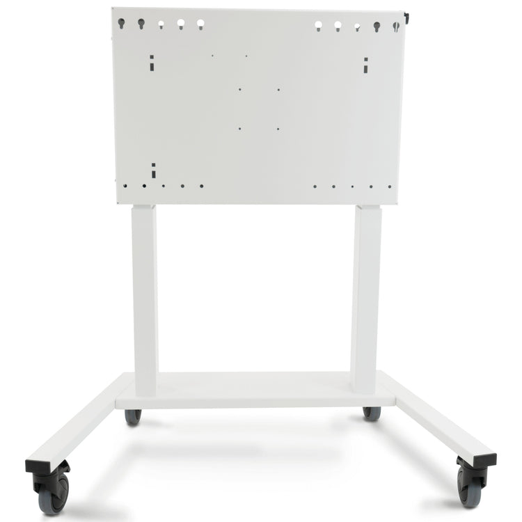 Designed for the current line of SMART Board interactive displays, the SMART electric height-adjustable mobile stand features 26" (66 cm) of powered height adjustment with a safety bounce-back feature that reverses direction briefly if an obstruction is detected. With its wide footprint and sturdy steel frame, the stand supports displays up to 86" (218 cm) diagonal and 245 lb. (111 kg) total weight including accessories. You can easily roll the stand across smooth floors and secure with the industrial grade 4" locking casters. The stand has a TUV-certified drive system and complies with Americans with Disabilities Act (ADA) standards. The stand also includes VESA mounting points for easy installation of the display and peripherals, a locking storage cabinet, and a power bar.