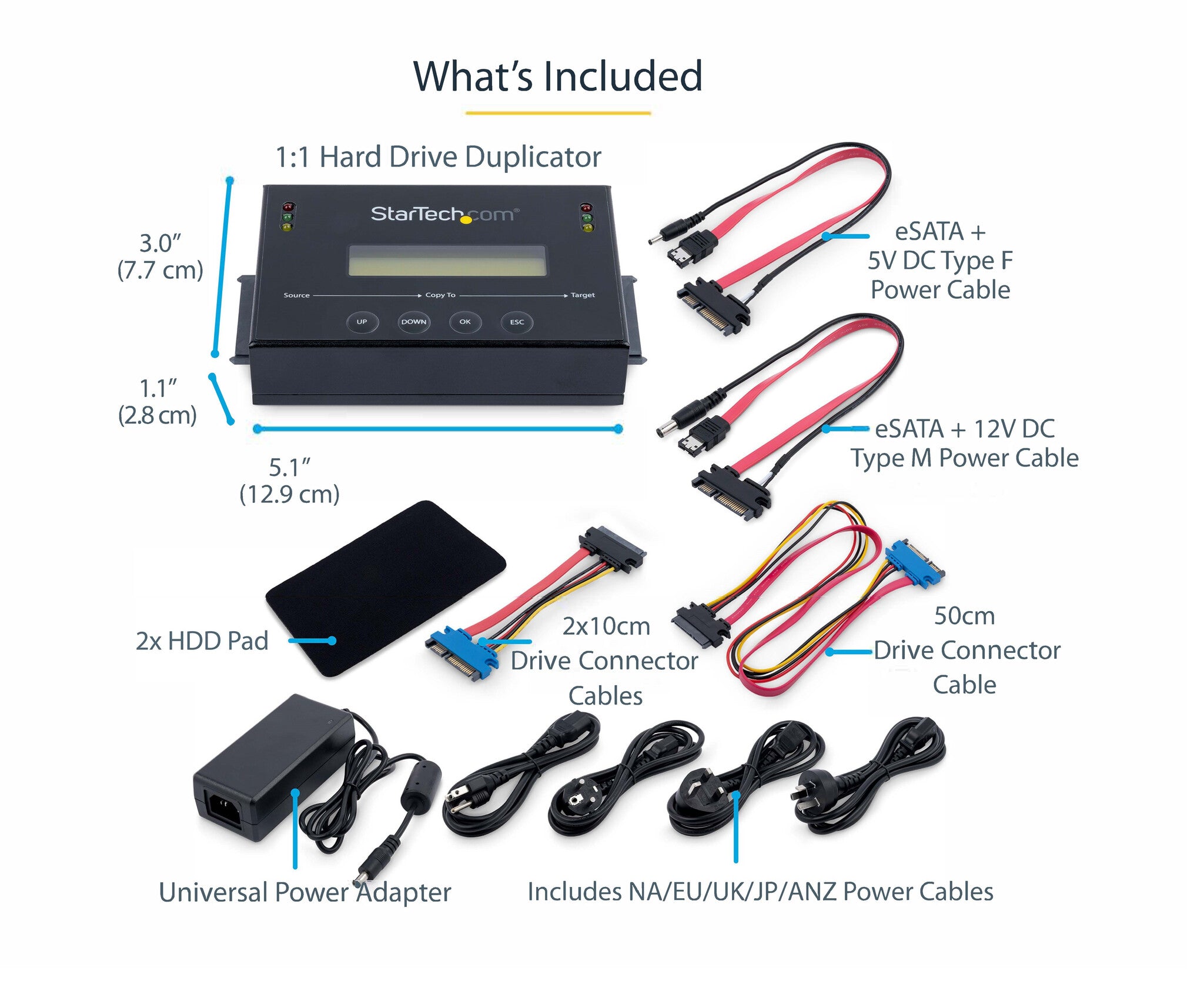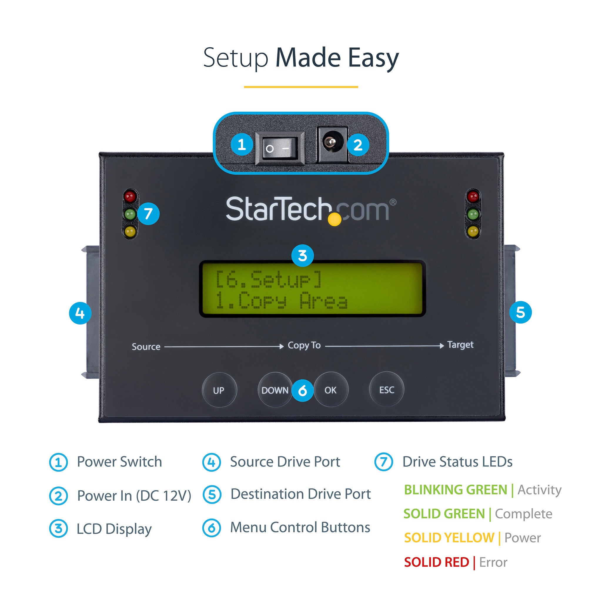• DRIVE DUPLICATION MODES: 4 Duplication Modes: System and File, All Partitions, Percentage Copy and Sector-by-Sector (Whole Drive) / 6 GB/min Copy Speed / SATA III (6 Gbps) / LCD Display / LED Indicators / Steel Enclosure / TAA Compliant