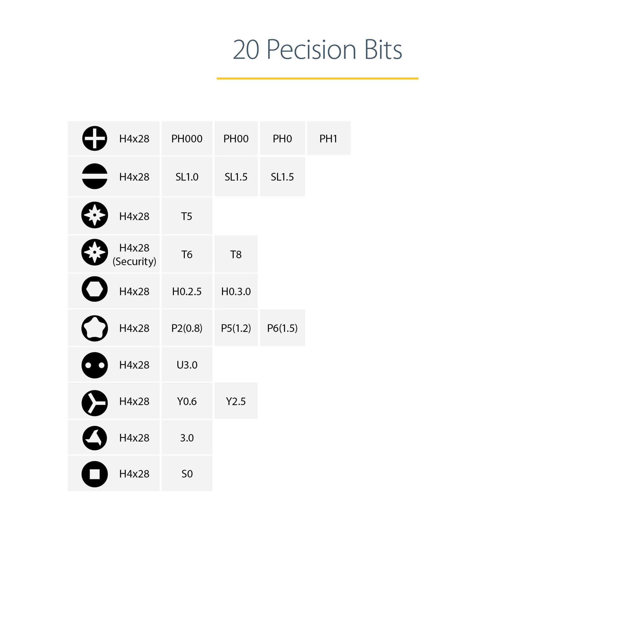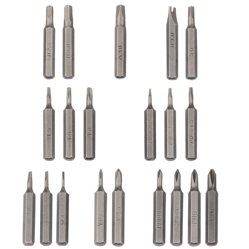 - PRECISION BITS: 20 piece set; Philips (PH000/PH00/PH0/PH1), Slot (SL1.0/SL1.5/SL2.0), (TORX T5), TORX Security T6/T8, HEXAGON (H2.5/H3.0), Pentalobe P2(0.8)/P5(1.2)/P6(1.5), Spanner (U3.0), Tri Wing (Y0.6/Y2.5), Triangle 3.0, Robertson S0