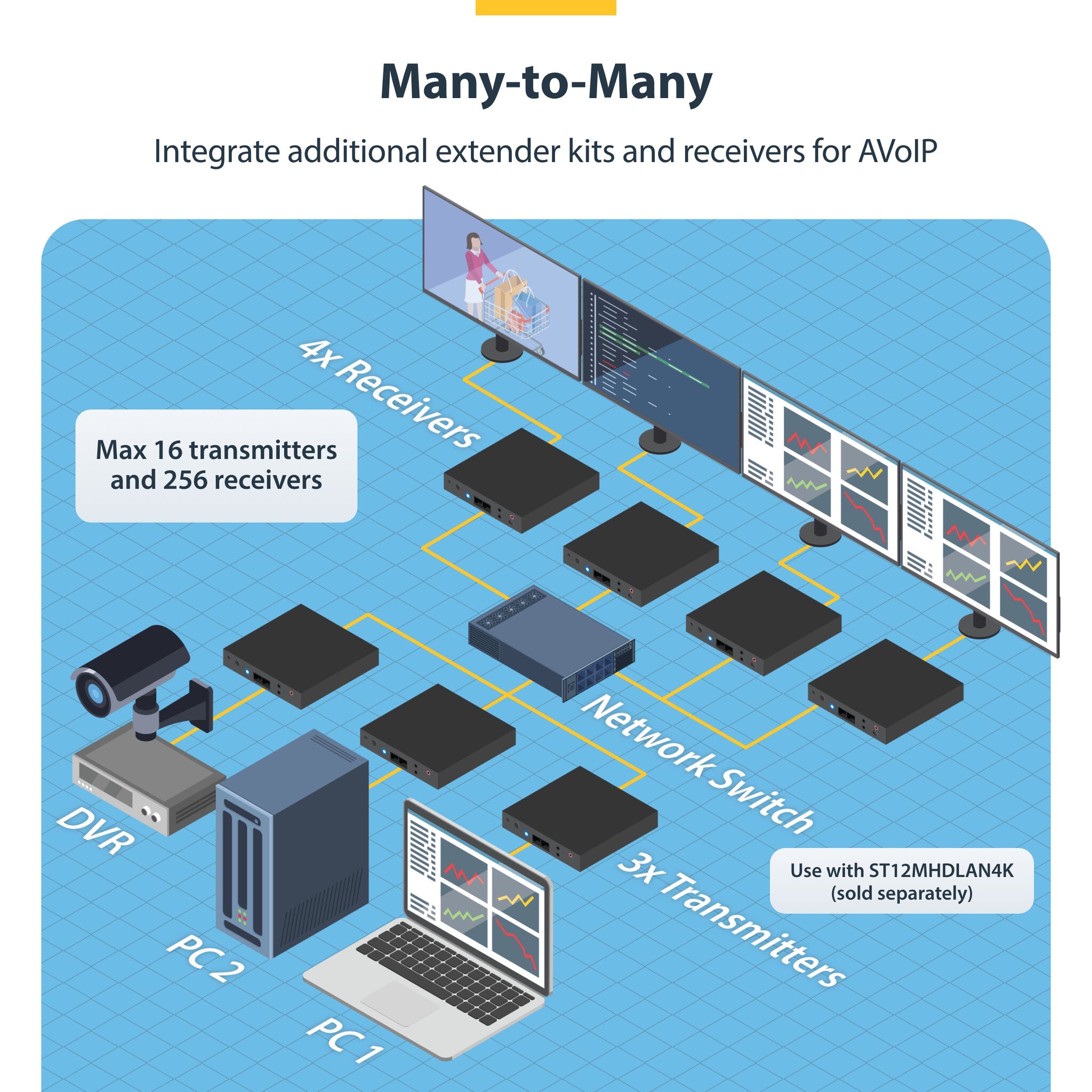 • Many-to-Many : Integrate up to 16 [%product id="ST12MHDLAN4K extender kits and additional ST12MHDLAN4R receivers with a maximum of 16 transmitters and 256 receivers.