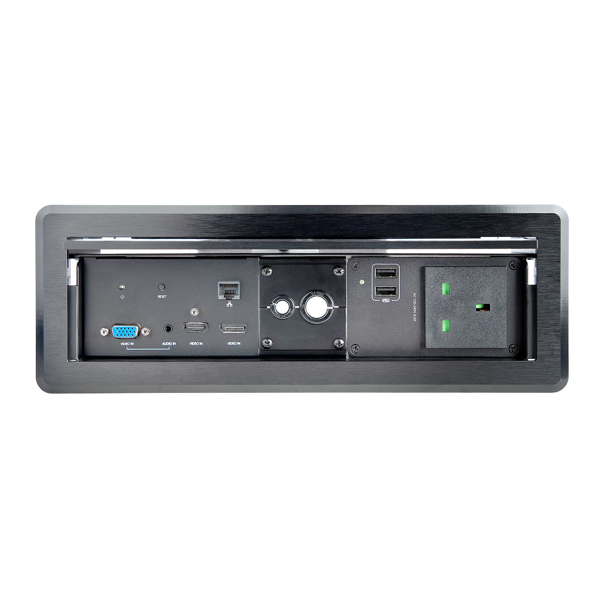 • EASE OF INSTALLATION: Includes manual, cut-out template, and all hardware needed to install in or under work surface; Variable depth mounting to work w/ several table top thicknesses; Route cables under the desk for a clean setup; Black aluminum finish