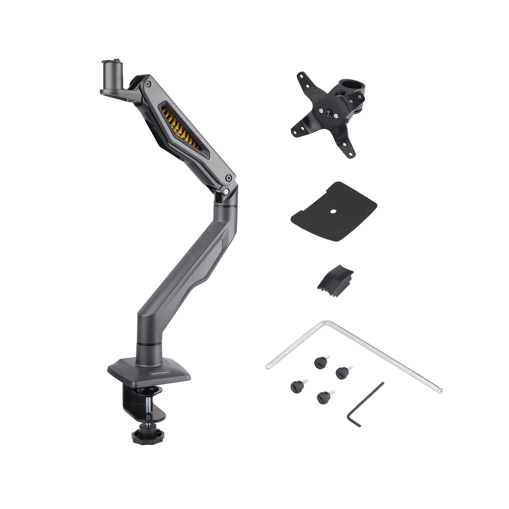 The monitor arm comes pre-assembled and includes a VESA monitor plate that uses thumb screws to securely mount the monitor quickly and without additional tools.