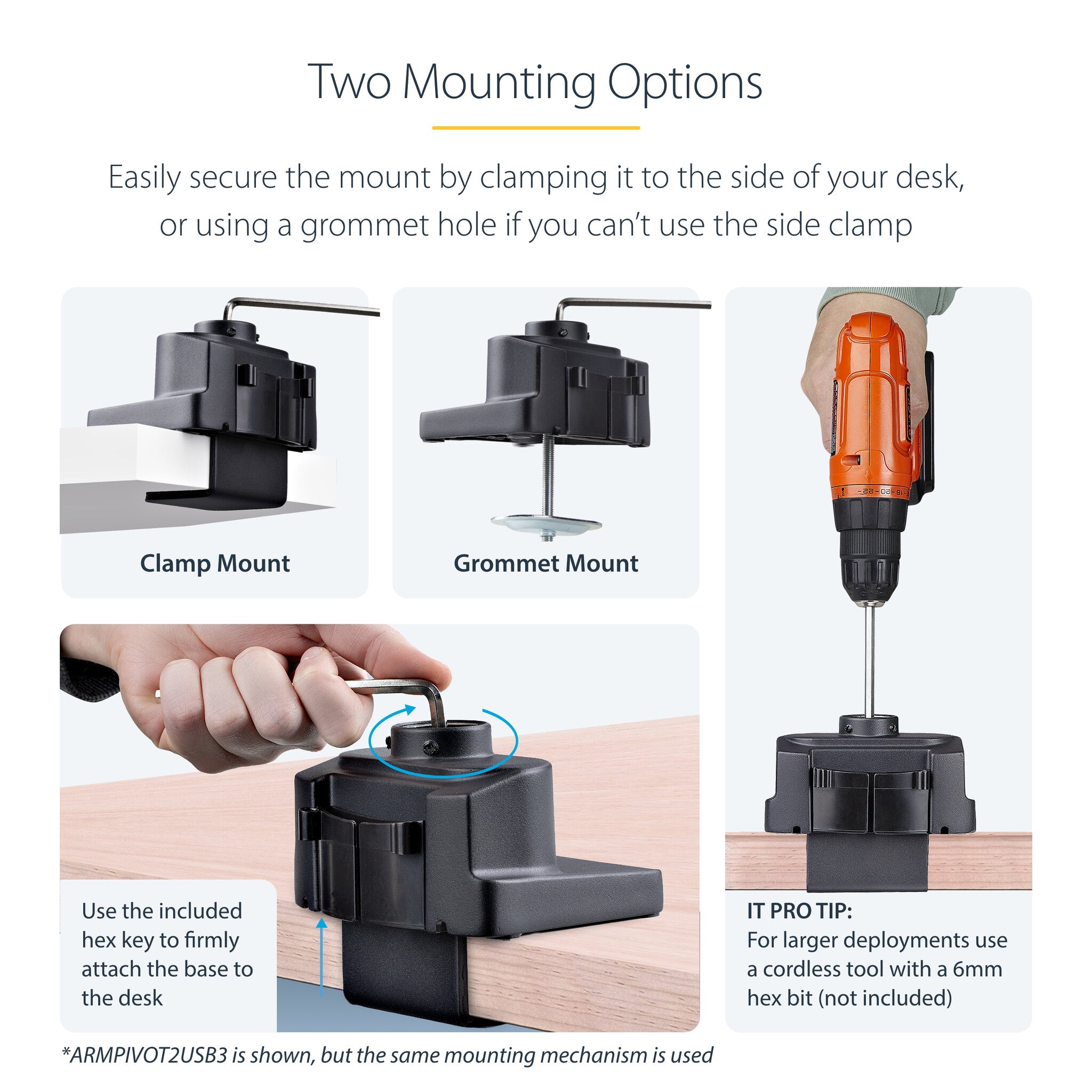 - EASY INSTALLATION: Tighten c-clamp from top w/ incl. tool or grommet mount to secure to desktop (10 mm-50 mm); Easily mount display w/ detachable VESA plate; tools incl. to adjust articulation tension