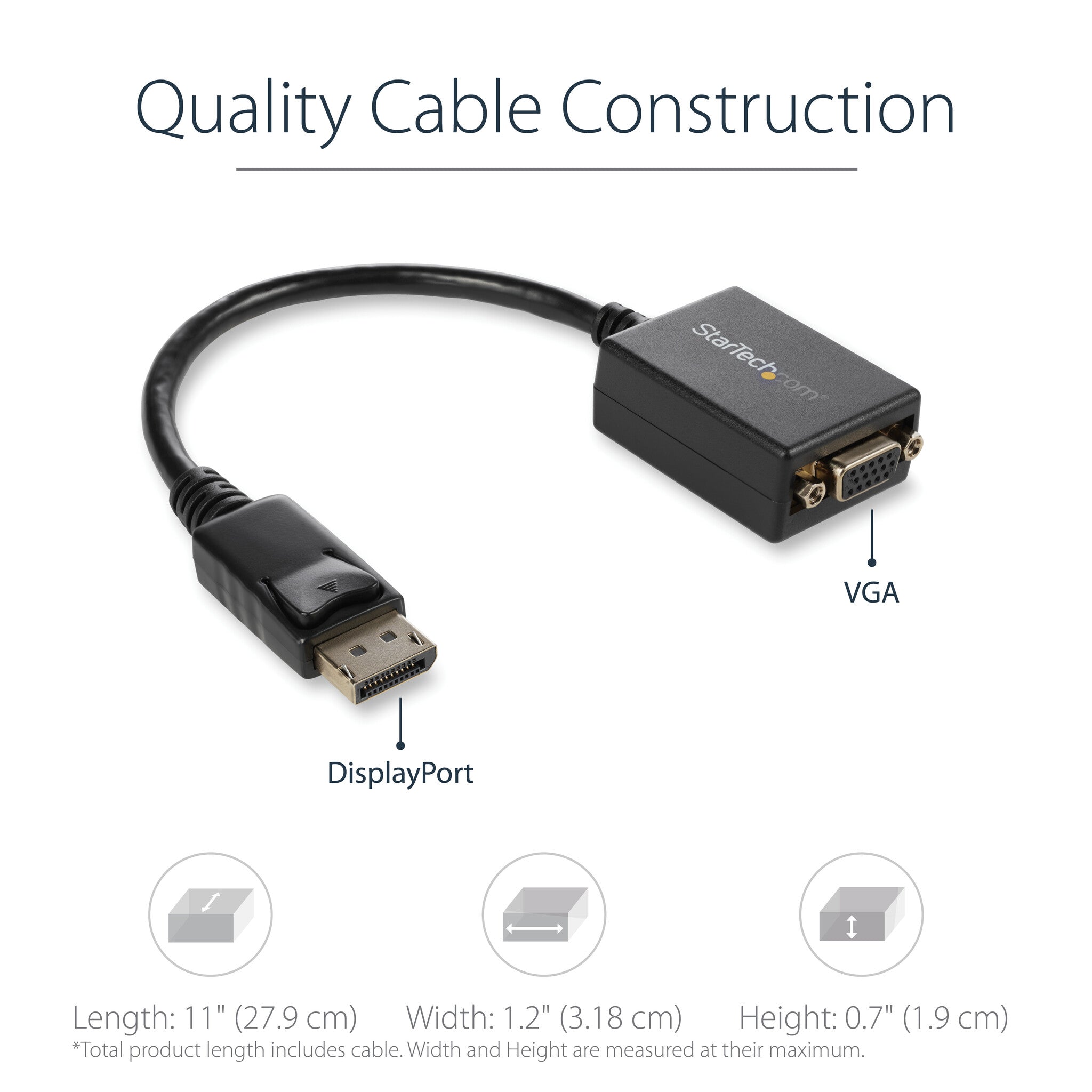 • DISPLAYPORT TO VGA ADAPTER: DisplayPort 1.2 (HBR2) adapter connects a VGA display/projector supporting 2048x1280, 1920x1200 & 1080p at 60Hz; EDID & DDC pass-through ensure compatibility between source & display / 9" (22.5cm) cable / DisplayPort Certified