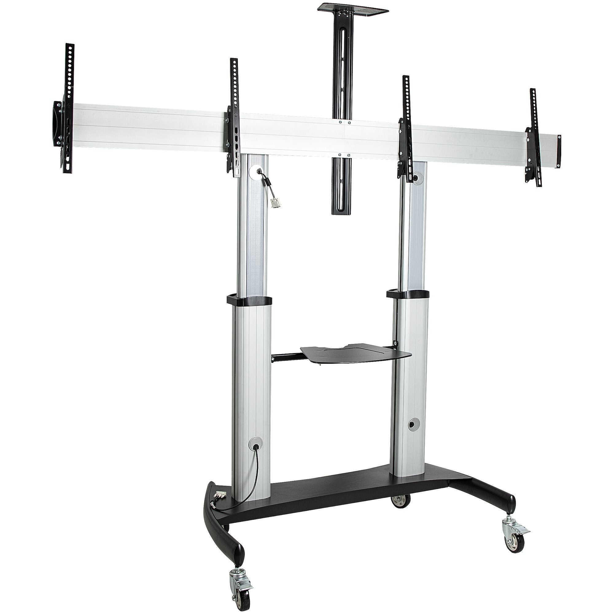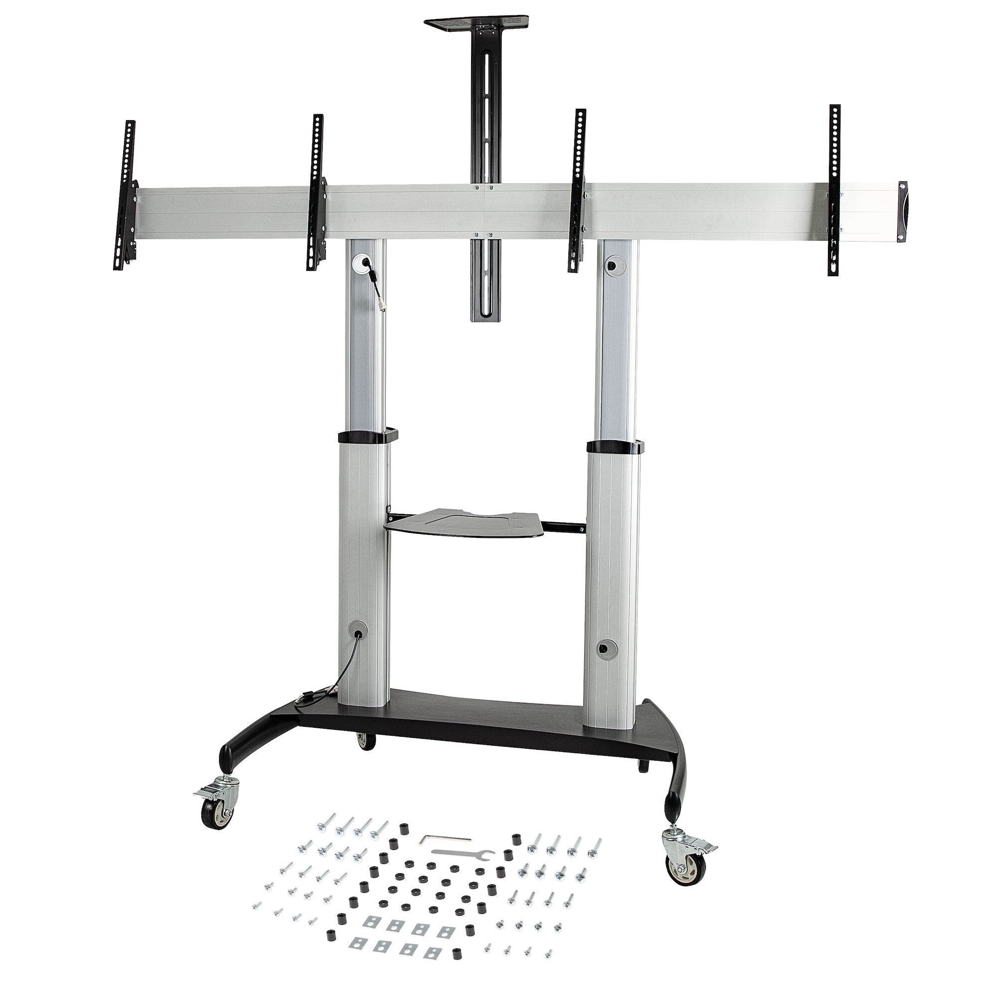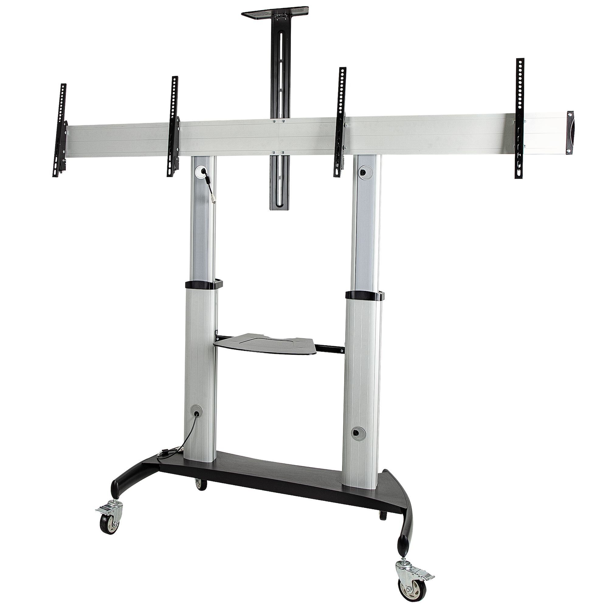 This Dual Mobile TV Stand enables you to create a rolling AV media center that is easy to move across classrooms, offices, boardrooms, meetings, or learning environments. For better stability and safety, the mobile cart was engineered with a large 1.22m x 0.71m base that will let you can mount two displays of 37" to 60" and up to 110lb/each in weight.