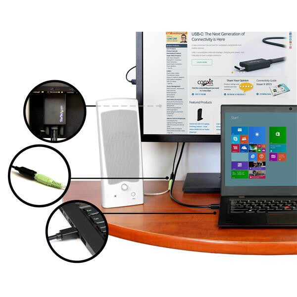 The adapter guarantees you always have all of the connections you need. If the audio port on your computer is damaged or blocked, this adapter cable ensures you still have sound available for watching video presentations, listening to music while you work or chatting with your colleagues over Skype.