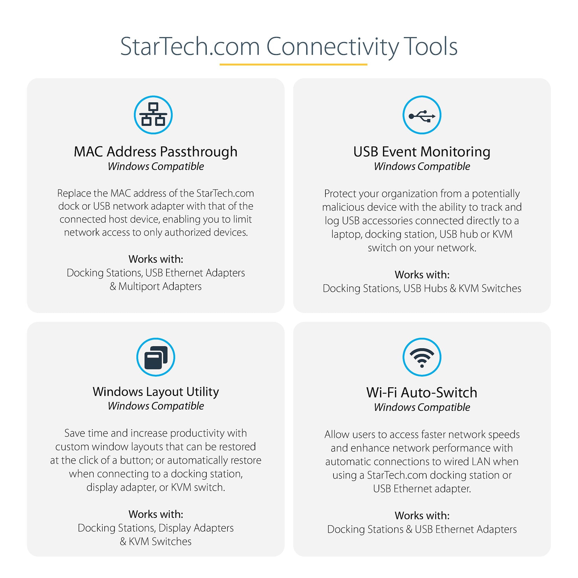 • OUR ADVANTAGE: Includes power adapter that simultaneously provides 85W of Power Delivery to charge the laptop & full power to all ports; Connectivity Tools w/Network MAC Address Pass-Through, WiFi Auto Switching, USB Event Monitoring & Windows Layout
