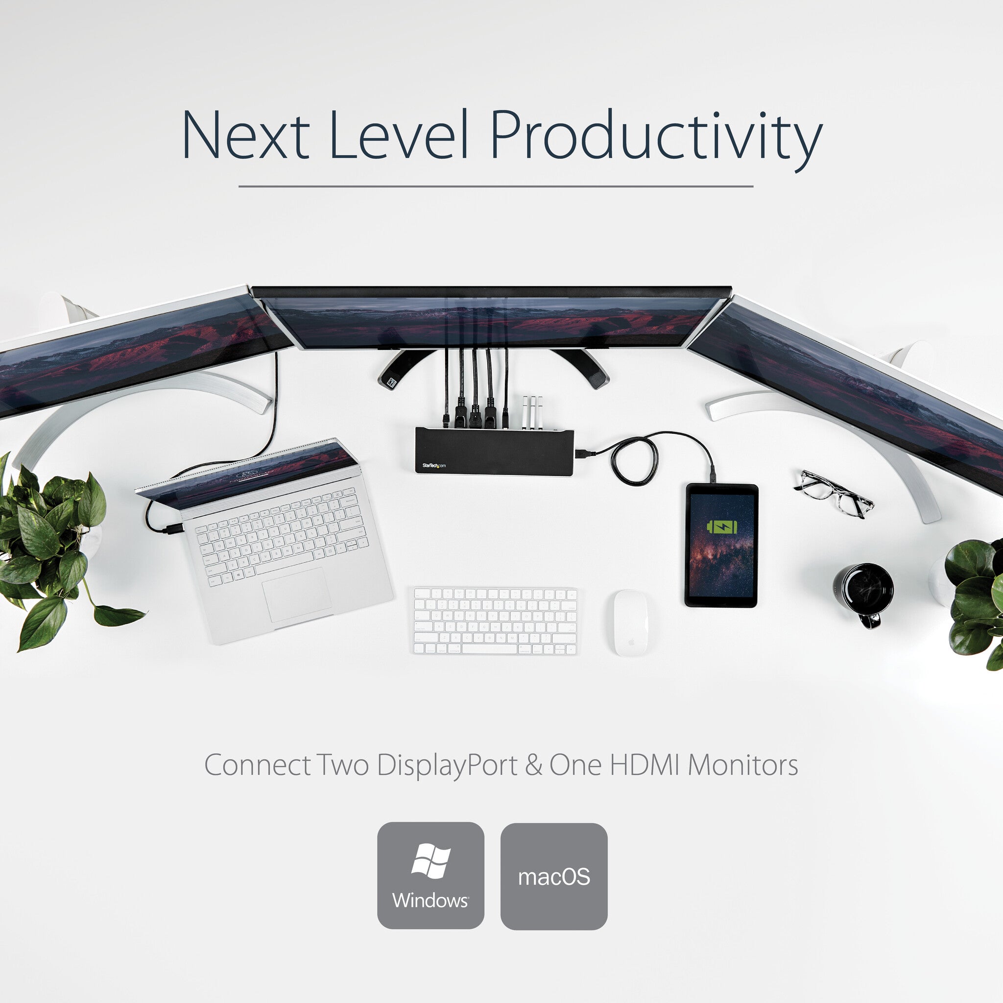The USB 3.0 docking station adds triple-monitor support to your workstation, with resolution support up to 4K (3840 x 2160p) on one display and 2048x1152 on the other two. With more screens, combined with high resolution, the dock maximizes your screen real estate so you can simultaneously access multiple applications and compose on one display while referencing material on the other. You can also use your laptop screen for four displays in total, making it easy to manage several programs at once and avoid the nuisance of minimizing or rearranging windows.