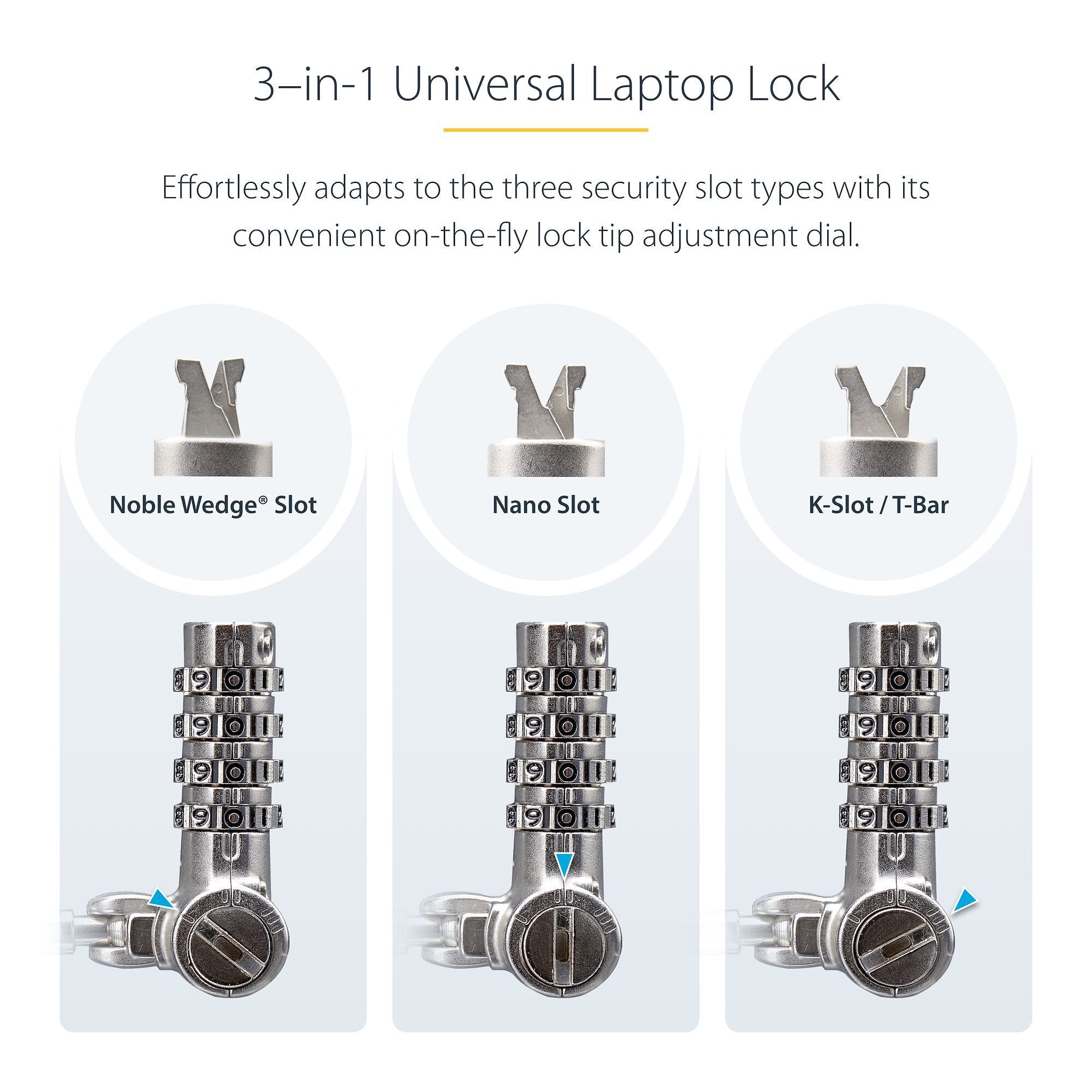 • UNIVERSAL 3-IN-1 LAPTOP LOCK: Compatible with Noble Wedge®; K-Slot (T-Bar), and Nano lock slots using an adjustable lock tip; 6.6ft (2m) and 0.17in (4.4mm) thick cut-resistant carbon steel cable; Lock can withstand a pull force of up to 202lb (91.6kg)