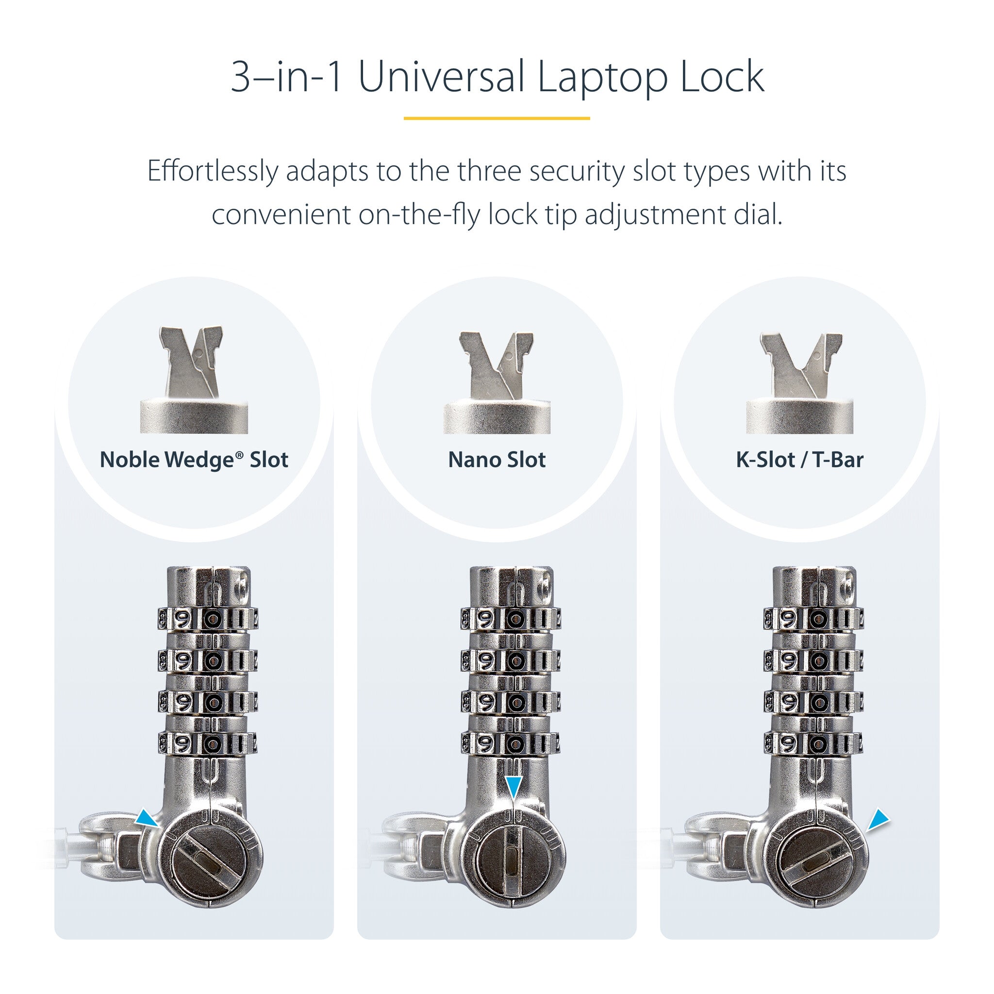 The Universal Laptop Lock is a versatile solution compatible with Noble Wedge®; K-Slot (T-Bar), or Nano, providing flexibility and convenience. With its on-the-fly lock tip change feature, you can quickly adapt the lock to different slot types. The cut-resistant steel security cable measures 6.5ft (2m) in length and 0.17in (4.4mm) thick, providing reach and durability. With the 3-in-1 Laptop Lock, protect your valuable devices wherever you go.