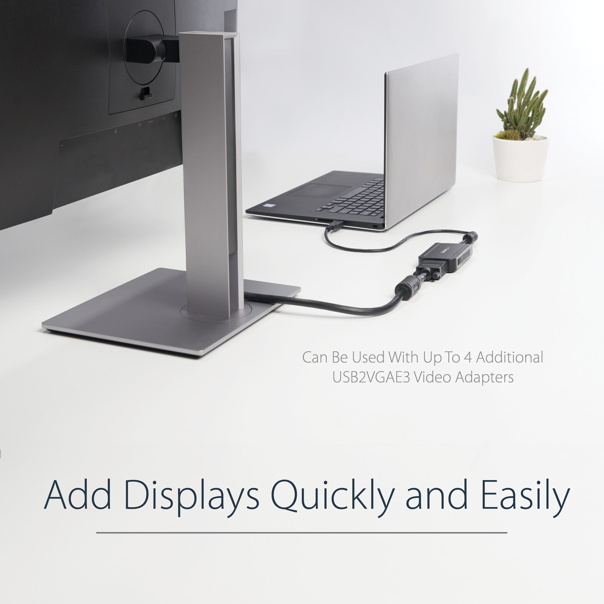 This small form factor USB video adapter can be used with up to 4 additional (5 total) USB2VGAE3 USB video adapters, creating multiple VGA connections to add displays quickly and easily - all without having to open the computer case to add extra video cards.
