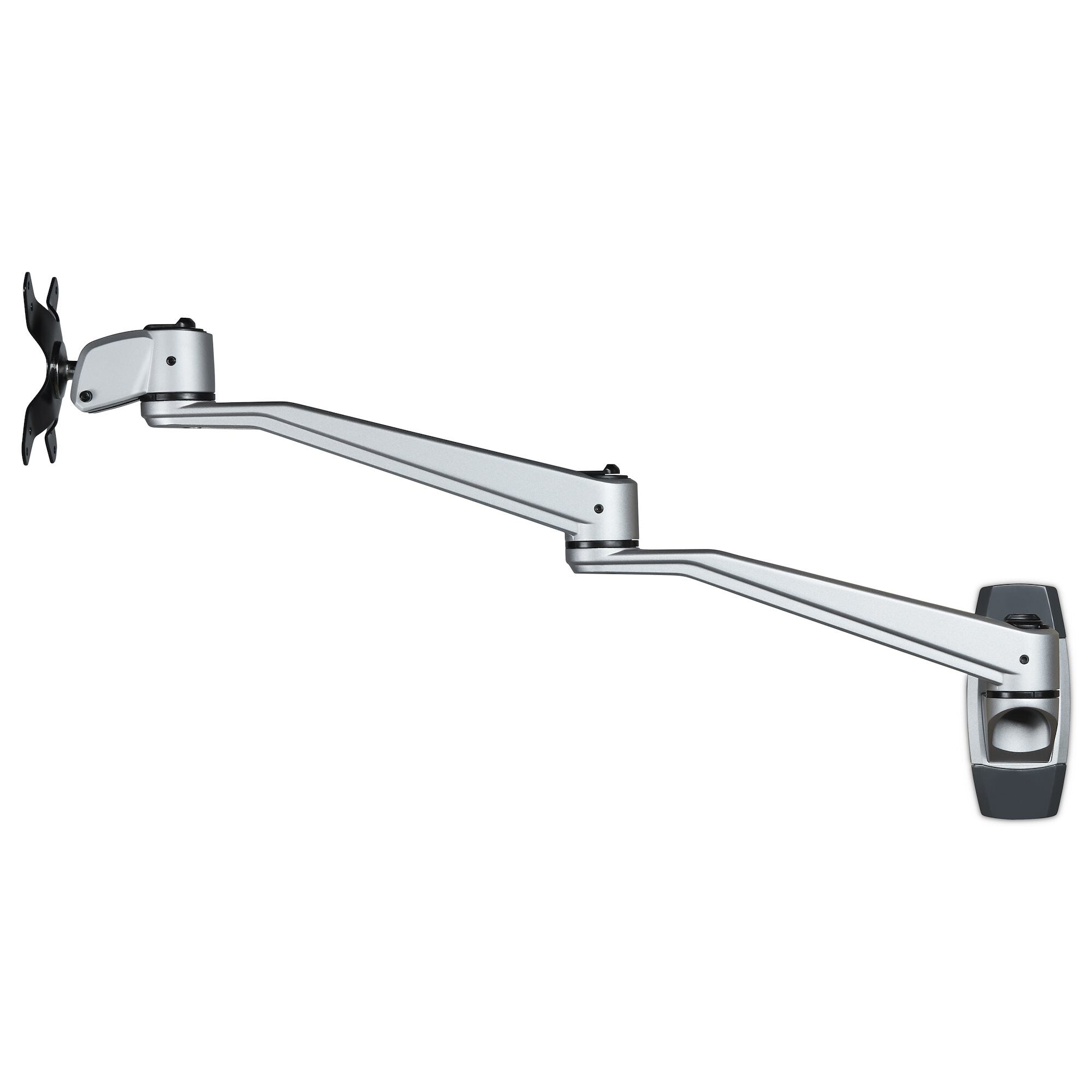 Free up space with this wall-mount monitor arm and enjoy optimum viewing with the long dual-swivel extension arm. The premium design ensures smooth, effortless motion and makes it easy to re-position your display, to work in comfort or collaborate with others. The attractive silver finish complements your decor.