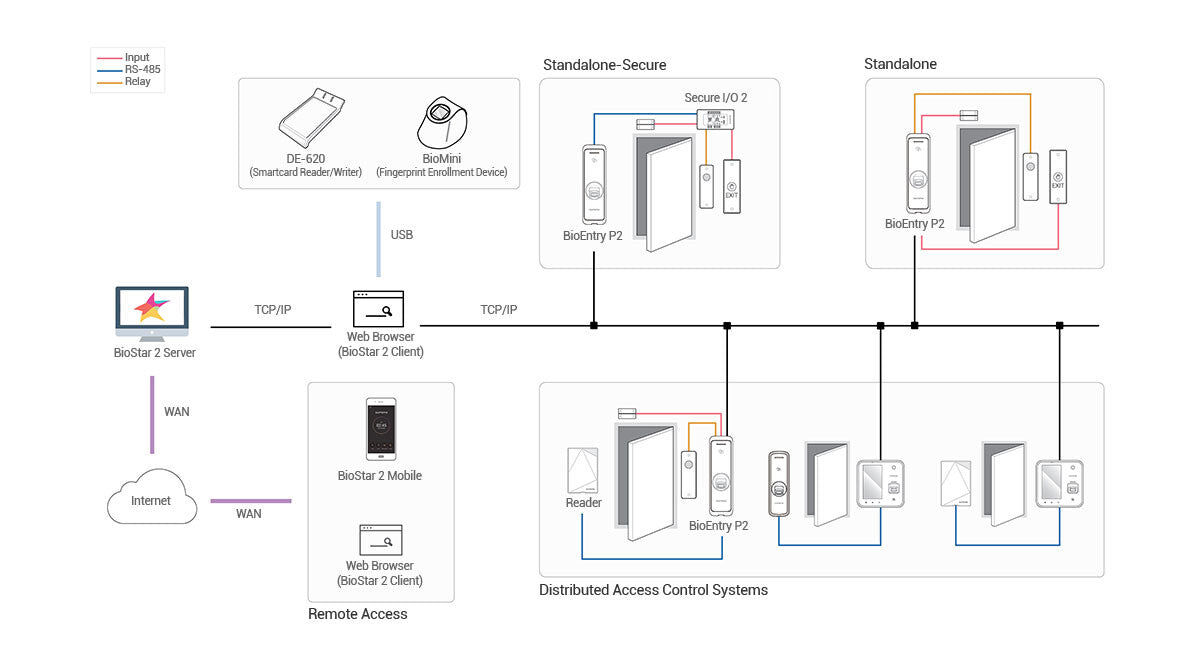 BioEntry P2 comes with not only a TCP/IP interface, but also more traditional interfaces (RS-485,Wiegand) to provide higher flexibility and multiple installation options for different environments. It also offers 2 internal inputs and 1 internal relay output to control peripheral devices. The I/O ports can also be expanded using the Secure I/O accessory.