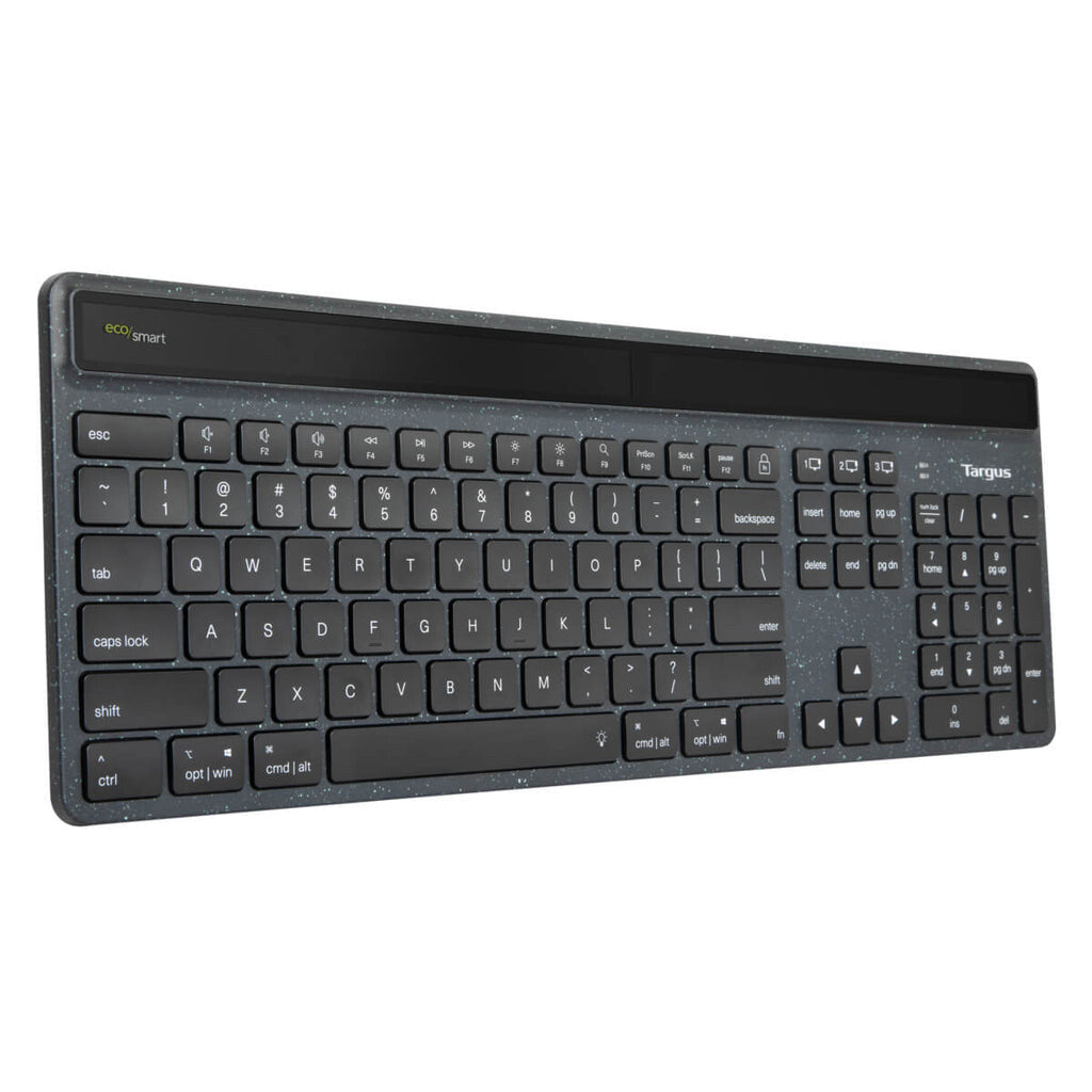 The Targus® Sustainable Energy Harvesting EcoSmart™ Keyboard combines Bluetooth® and advanced solar technologies with post-consumer recycled materials in an eco-friendly, full-size keyboard. Manufactured from up to 85% recycled material and infused with antimicrobial protection*, this keyboard helps to prevent the growth of micro-organisms, while helping to protect the environment - even its packaging is recycled. It’s primarily powered by solar cells optimised to harvest light from a variety of light conditions (including indoor artificial lighting) and connects to up to 3 devices using Bluetooth® SoC, which means its extremely low-power capabilities makes it 3 to 4 times more power-efficient than other Bluetooth keyboards. And, this keyboard features Targus DefenseGuard™ Antimicrobial Protection. Unlike topically applied sprays, this DefenseGuard keyboard is infused with antimicrobial additives that don’t wear or wash off, and works continuously for the life of the product.