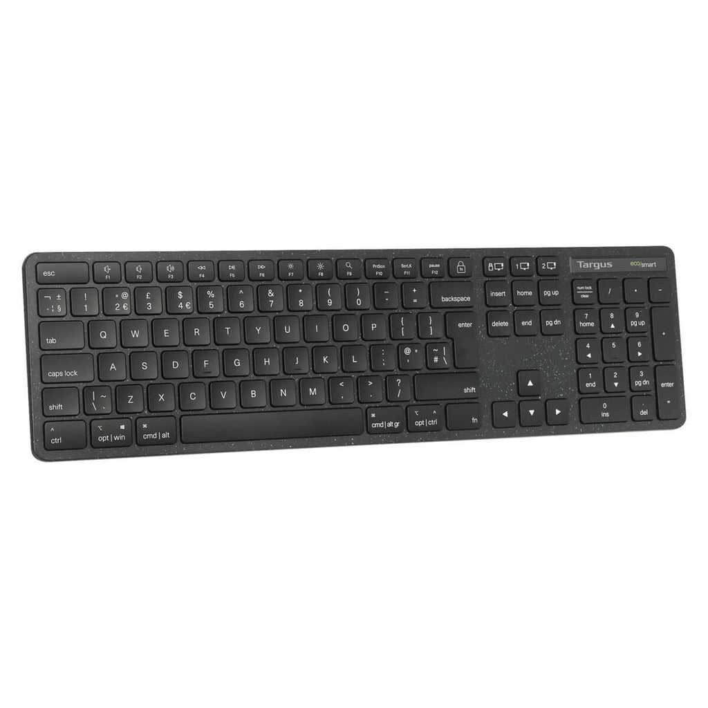 The Targus® Full-Size Wireless EcoSmart™ Keyboard combines wireless connectivity with post-consumer recycled materials in an eco-friendly, full-size design. Engineered to embody sustainability in the workspace, this eco-conscious keyboard is manufactured from up to 85% recycled material. For ultimate flexibility, it wirelessly connects via ultra-low power Bluetooth® BLE 5.0 or a 2.4 GHz radio frequency. It’s lightweight, comfortable to use, and supports multi-device connectivity. Overall, a smart addition to your workspace.