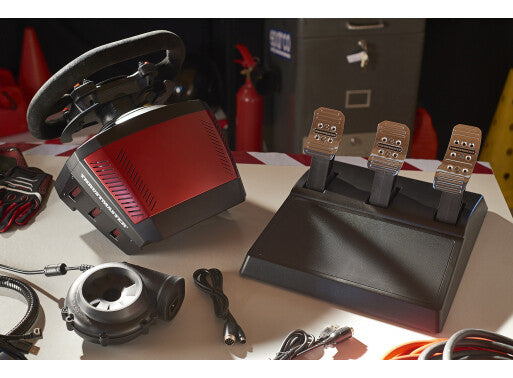 Racing wheel, pedal set, Turbo Power power supply, attachment system, user manual and consumer warranty information.