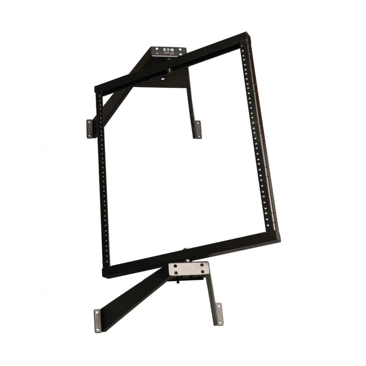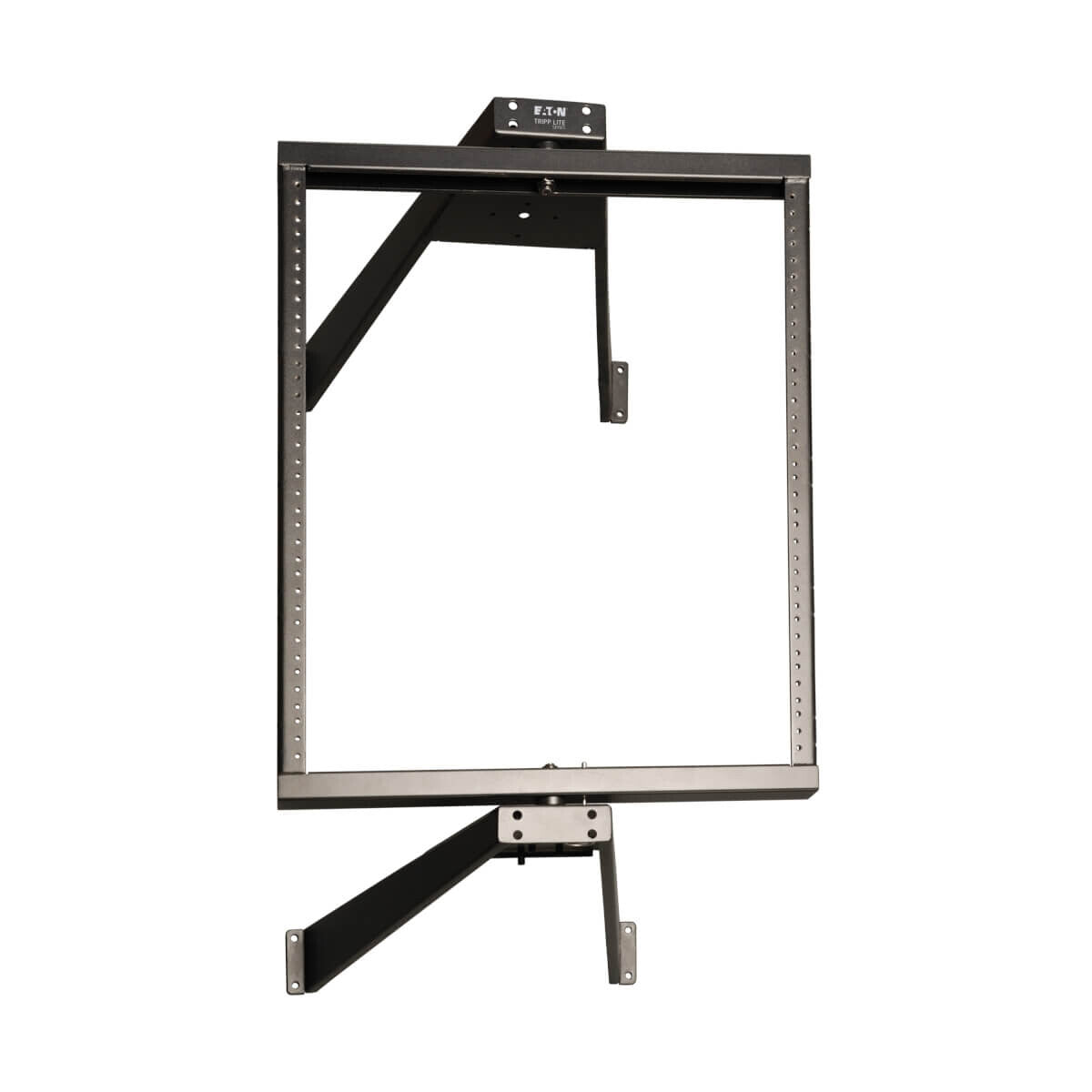 The open frame design pivots to allow unrestricted access for installing, configuring and servicing equipment and cabling from any direction. The rack is simple to assemble and mount to the wall. Threaded 12-24 mounting holes and numbered rack spaces make equipment installation easy. Included locking pins secure the frame in position while pivoted for mounting equipment. The vertical mounting rails accommodate equipment up to 18 inches deep, such as network switches and patch panels. Assembly and equipment-mounting hardware is included.