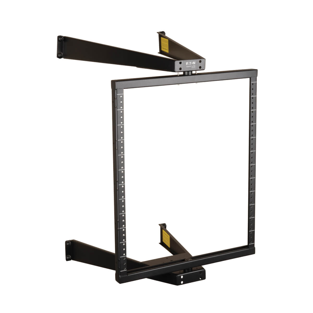 The SRWO12US SmartRack 12U Flat-Pack Low-Profile Switch-Depth Wall-Mount Pivoting 2-Post Open Frame Rack stores and organizes EIA-standard 19-inch rack equipment compatible with 2-post mounting in network wiring closets, back offices and other secure areas with limited floor space where a locked enclosure is not required. Constructed from heavy-duty steel with a durable black powder-coated finish, the rack has a maximum load capacity of 150 lbs (68 kgs).