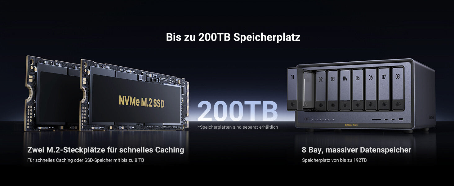 .8-Bay, 256TB Massive Data Storage: Equipped with eight SATA and two M.2 NVMe drive bays, the NASync DXP8800 Plus has a maximum storage capacity of up to 256TB. And supports JBOD/Basic/RAID0/RAID1/RAID5/RAID6/RAID10 RAID levels. Store thousands of HD movies, pictures, and documents, Making NASync a movie library, photo album, and file storage space all in one.