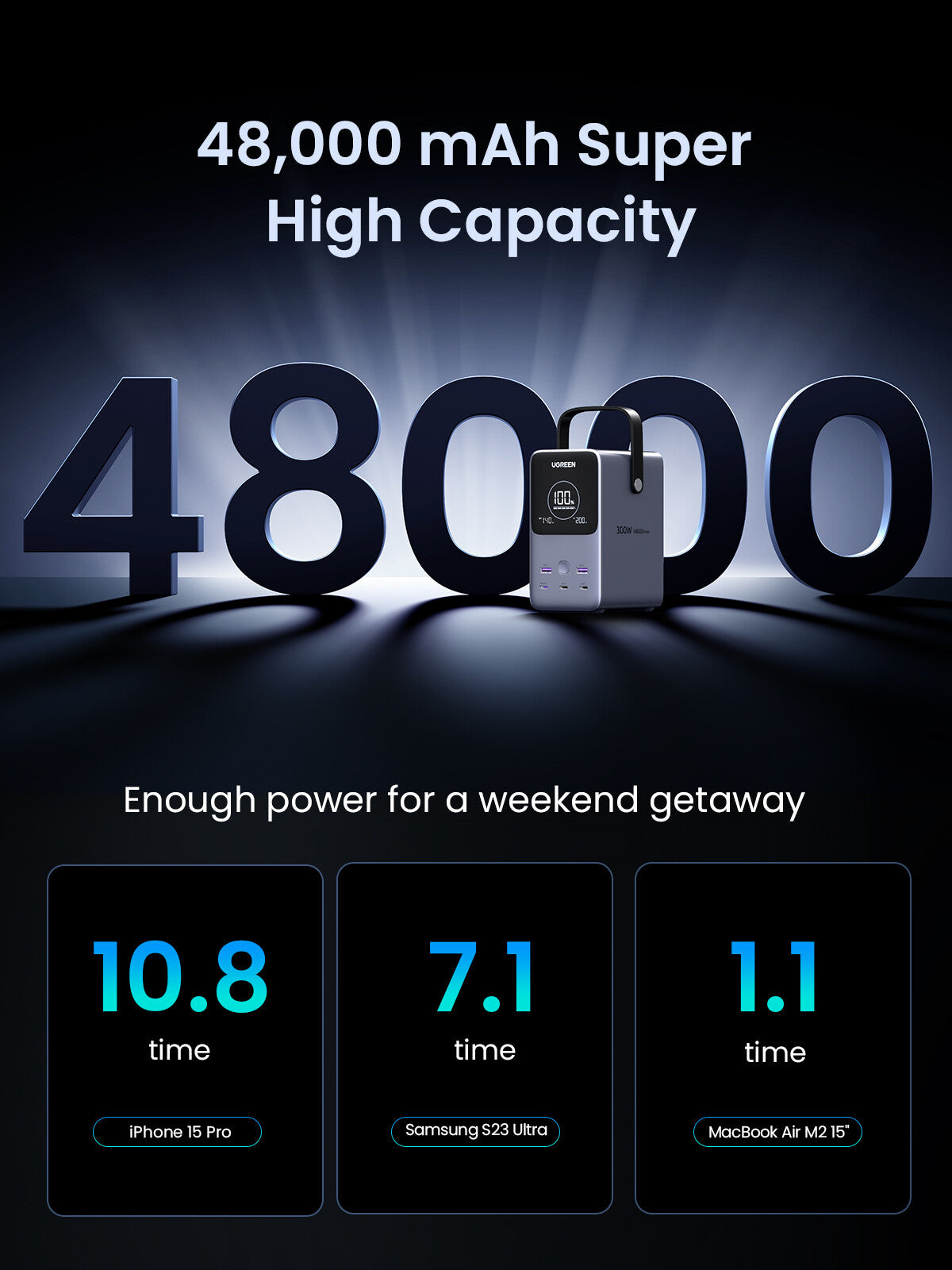- Long-Lasting Power: A whopping 48,000mAh capacity means 10.8 iPhone 15 Pro charges or 1.1 MacBook Air M2 15 charges. Perfect for long trips, meetings, or outdoor adventures