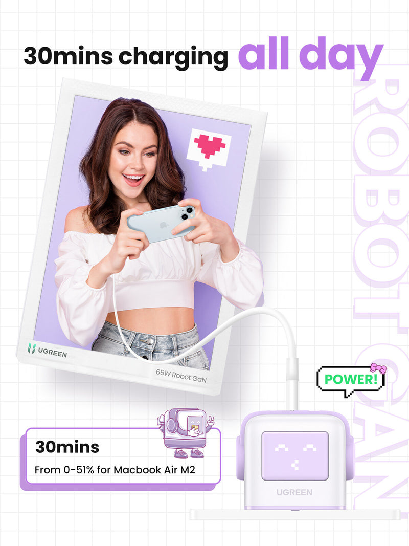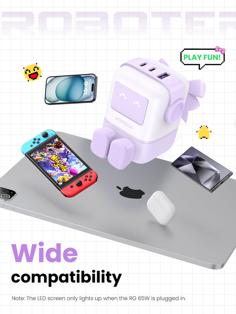 "Fun & Functional: A playful 65W charger with a robot face that reacts to charging.
